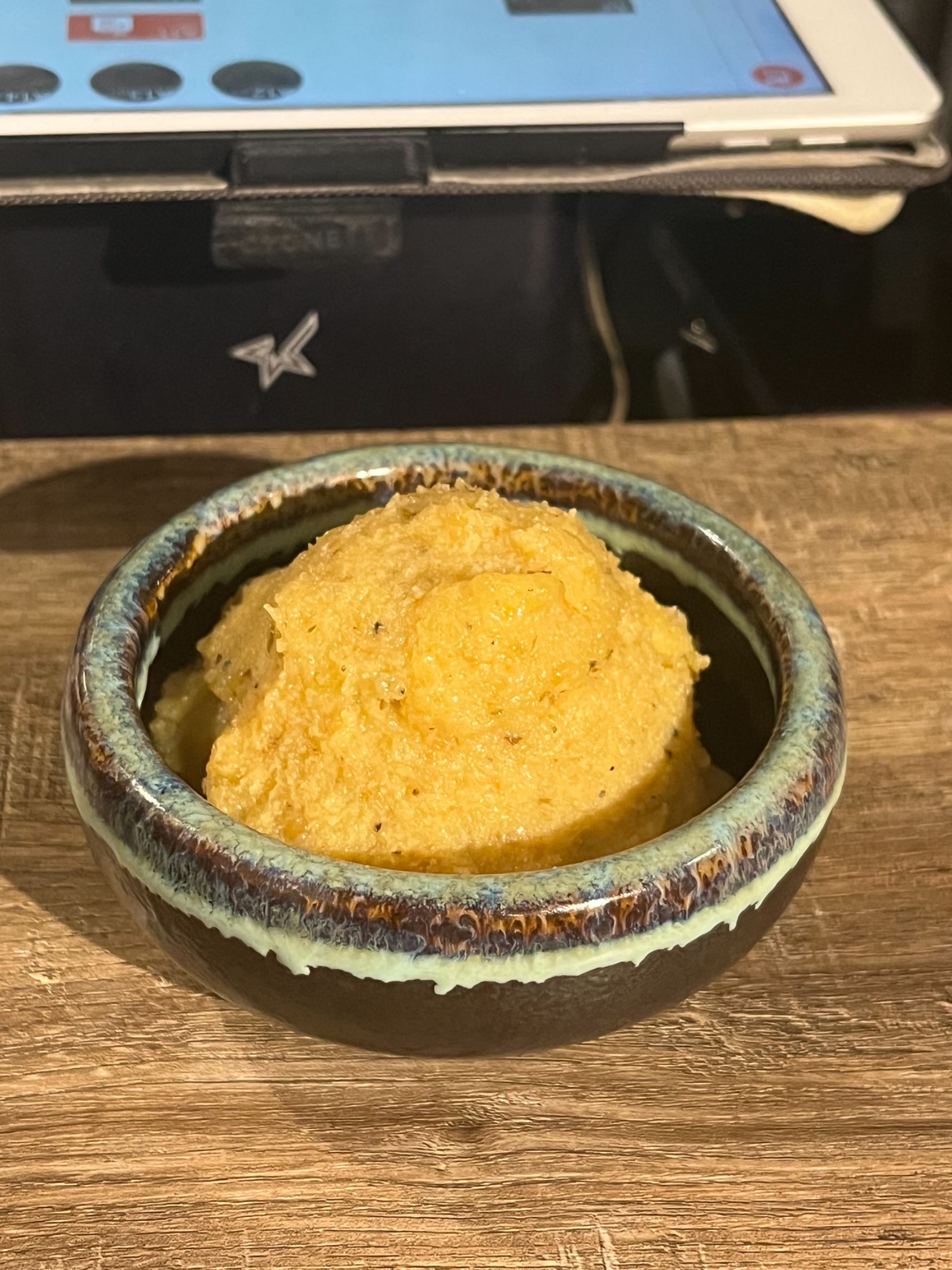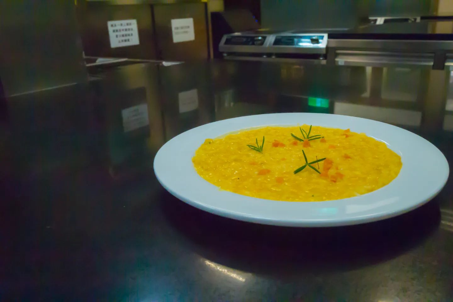 君品雲軒、茹曦 Sunny buffet 的黃琮智,取用熱炒店菜色「金沙南瓜」的食材組合,改以經典燉飯作法,為大家熟悉的風味換上新風貌。他在燉飯起鍋前加入發酵奶油,讓豐富的堅果香和奶香成為這道燉飯的點睛之筆。