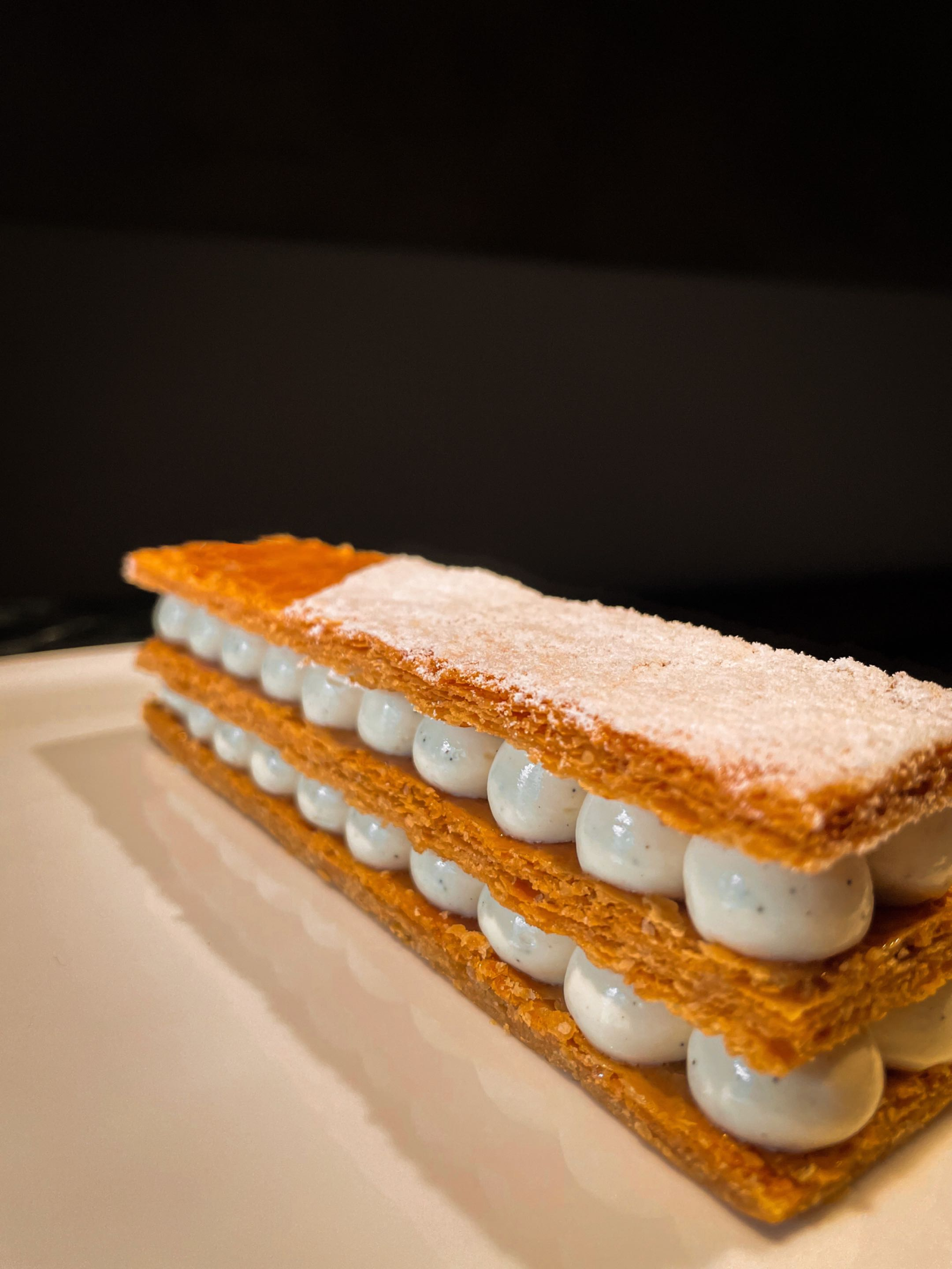 為了凸顯 Pepe Saya 發酵奶油特性,和逸飯店糕點主廚李芳瑜使用片狀奶油製作法式千層的派皮,在派皮間擠上香草卡士達醬。以這款簡單卻經典的甜點,呈現發酵奶油的濃郁奶香。