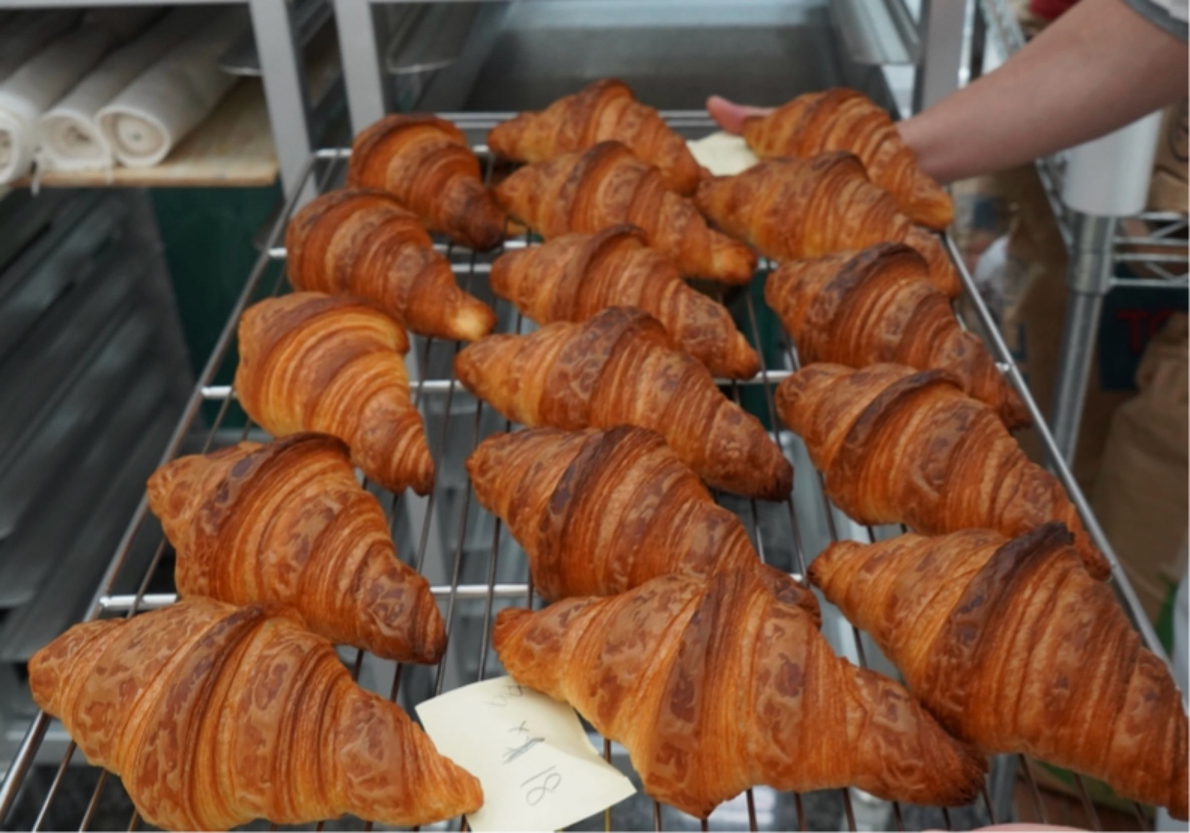 拾良烘焙主廚黃鈺翔一樣使用片狀奶油製作可頌,採取四折 1 次、三折 1 次的折疊手法。他覺得烘烤時可頌的膨脹性很棒,烘烤過程中香氣迷人,出爐冷卻後,又轉為舒服的淡麗清香,平衡了傳統觀念中可頌的油膩感。