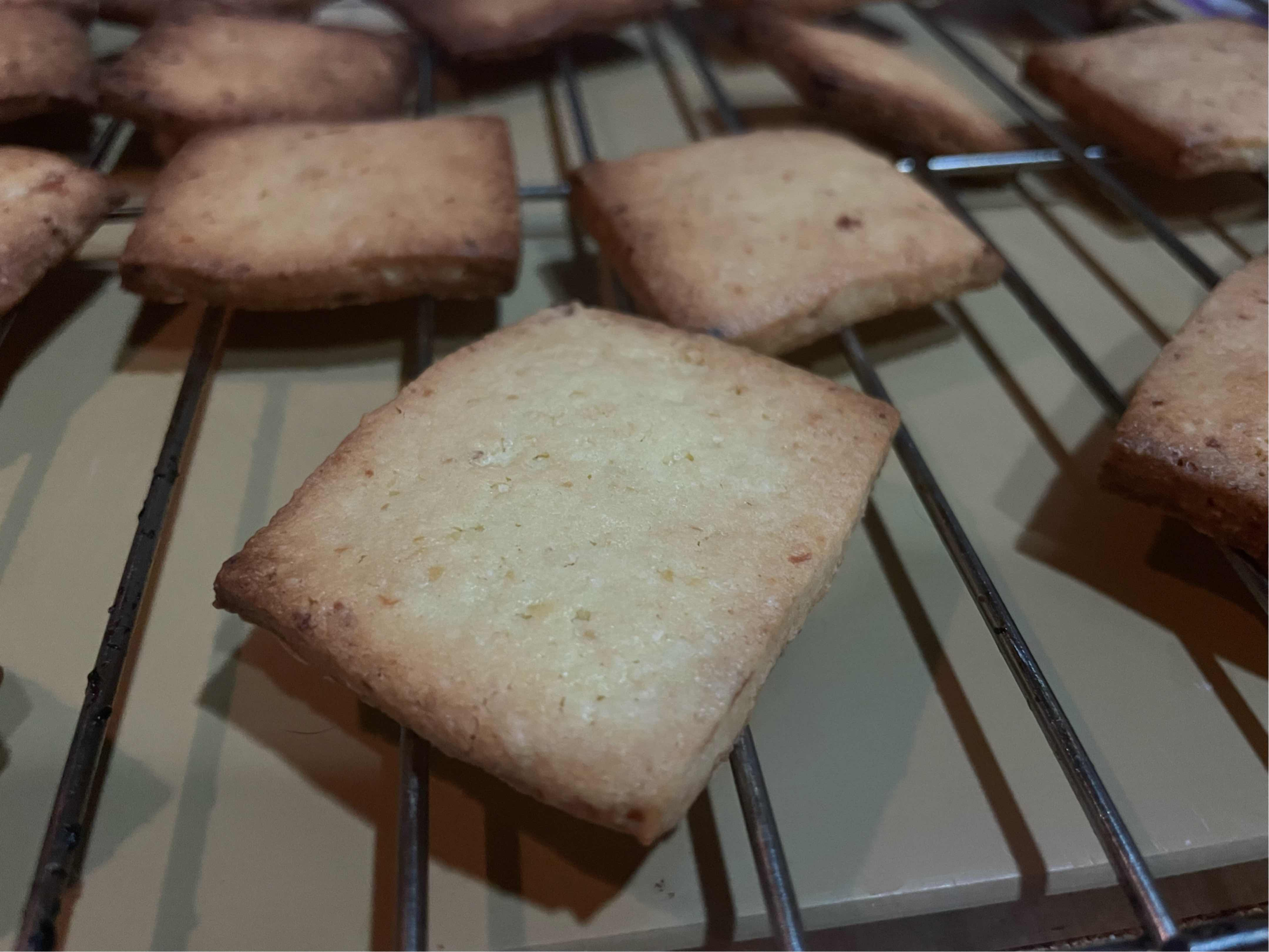 同行食旅廚師陳虹衣申請一般無鹽奶油,做成酒粕奶油餅乾。她將奶油攪拌到滑順後,與軟化放涼的酒粕跟味噌攪拌融合,再依序加入糖、蛋、麵粉等原料。烤出來的餅乾香氣足且味道清爽,但使用上需要花些時間熟悉它的質地與使用方式。