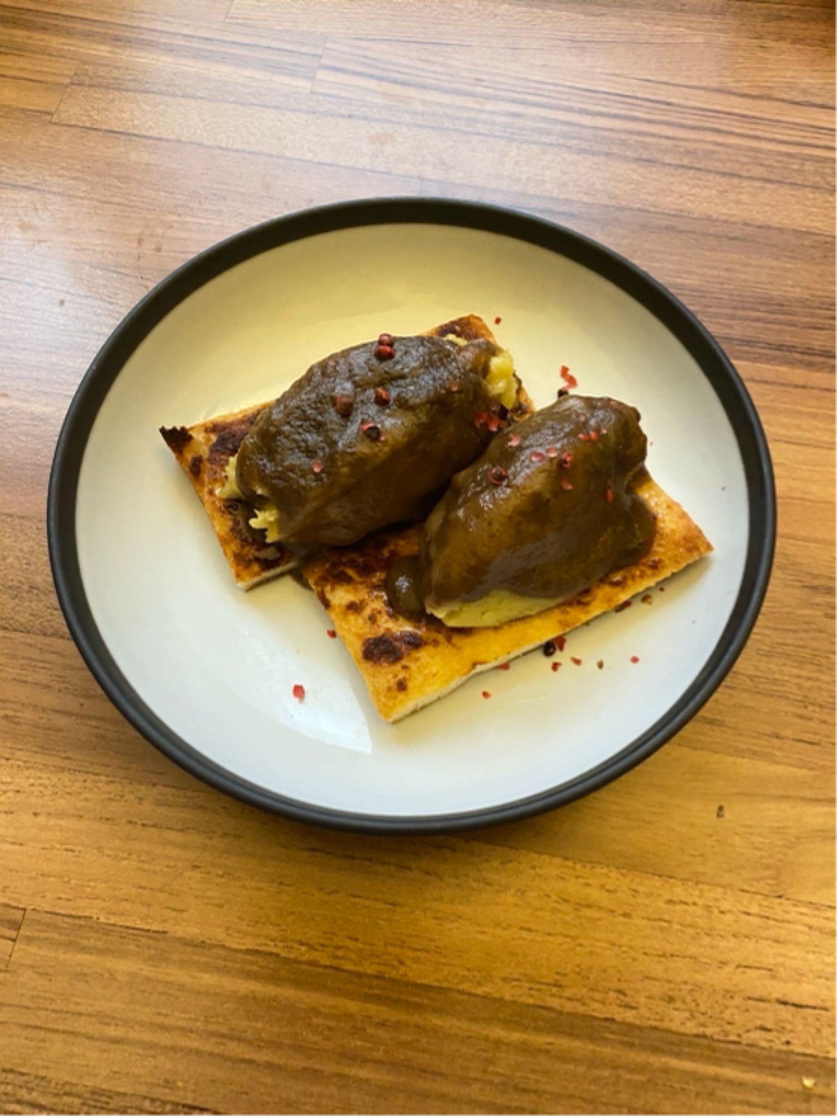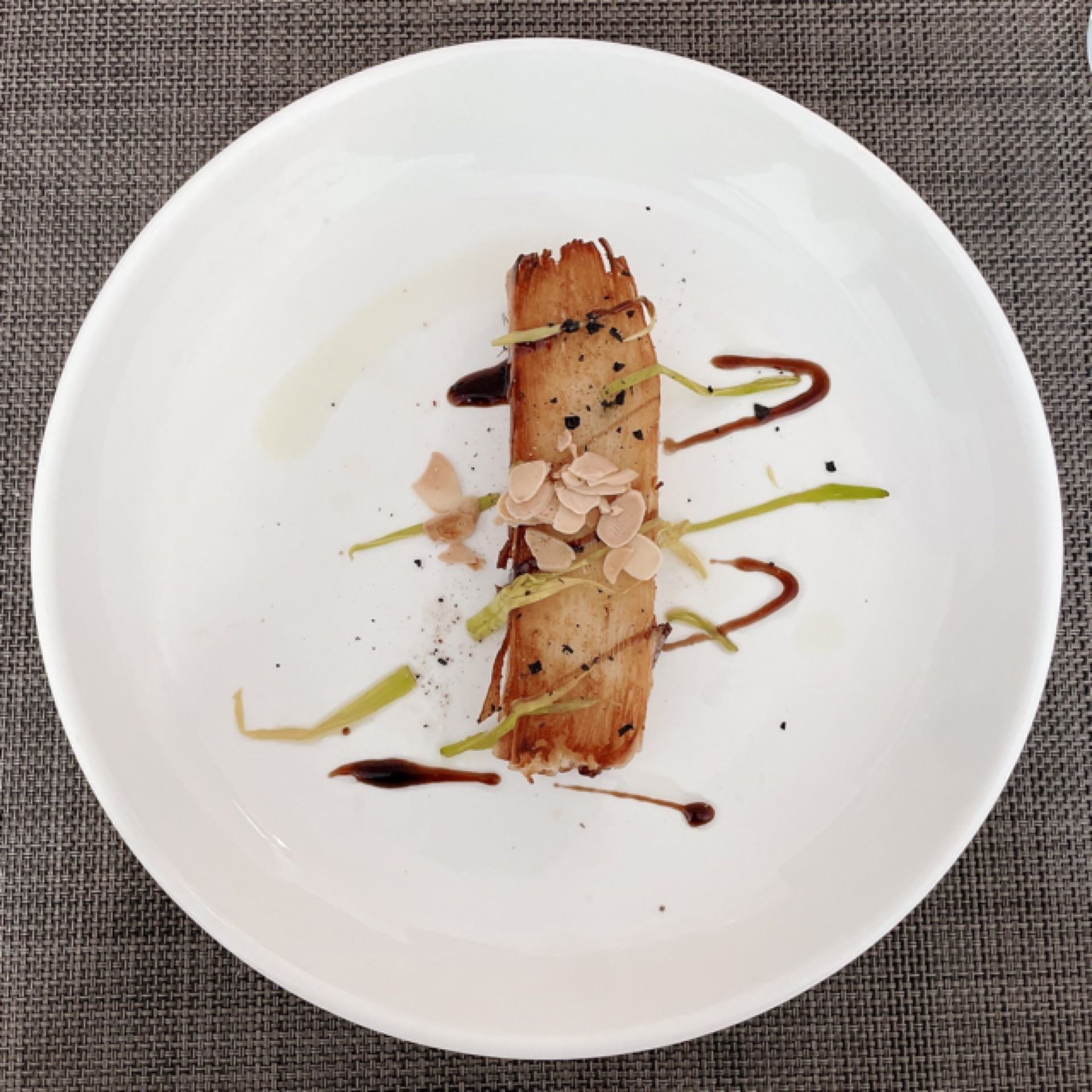種素 Zone Su 主理人黃繼賢發想的菜色是馬鈴薯千層。他將馬鈴薯千層先烤再煎上色,最後讓發酵奶油下鍋,用油淋法發揮發酵奶油獨特的香氣。