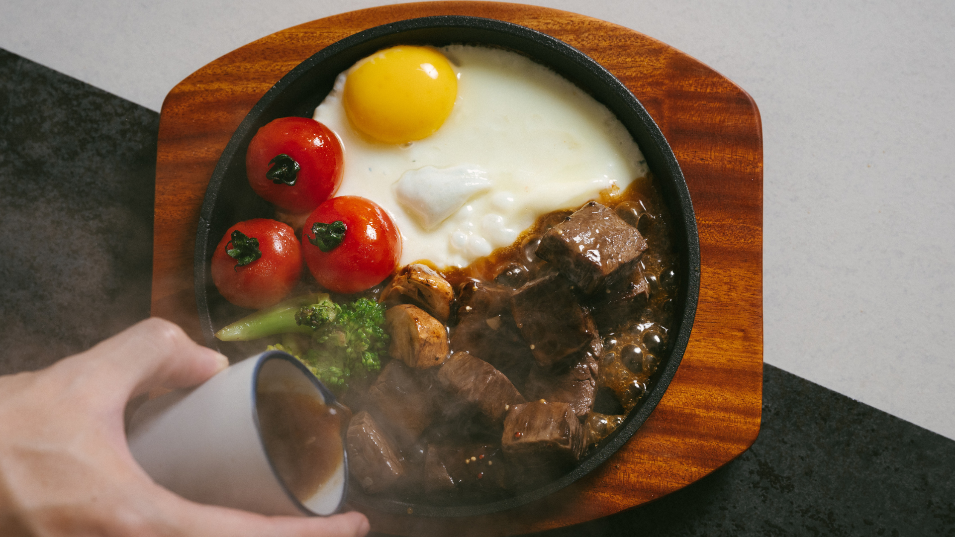 牛小排切成骰子狀,在燒熱的平底鍋裡四面煎上色後取出。同個鍋子直接加入蔭油膏、紅茶、粗粒黑胡椒,煮滾收汁一半成醬汁。接著準備一個燒熱鐵板,加入一匙沙拉油,打進雞蛋,依序放入汆燙蔬菜、牛肉再淋上醬汁,最後放上蒜片就完成了。