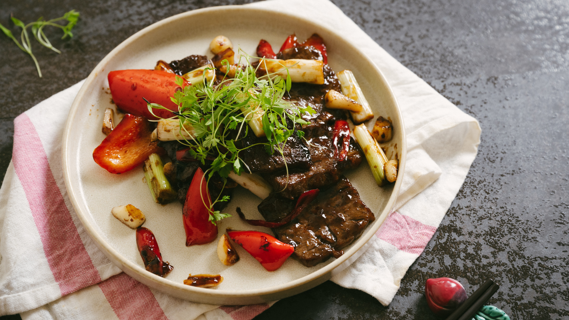 中式炒鍋燒熱後,將下後腰脊肉燒烤片一片片放入,盡量讓每片牛肉都能接觸鍋面,直到兩面都呈現咖啡色即起鍋。原鍋再加入一匙油,爆香蒜頭及辣椒。香氣出來之後放入牛肉,鍋緣淋入一匙米酒提香,再加入蠔油、 蔥白、紅甜椒,大火持續翻炒至所有食材油亮斷生。盛盤時在頂部放上山蘿蔔葉,以苗葉為醬香味濃的料理帶來一絲清新。