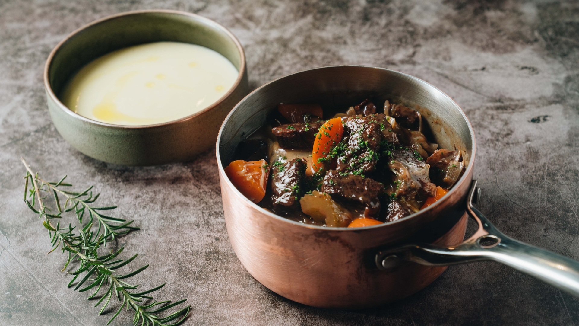 切塊牛小排首先下鍋,煎至表面金黃後取出。逼出的牛油正好將紅蘿蔔、洋蔥、西芹、番茄等蔬菜煎上色。350ml 的紅葡萄酒在壓力鍋裡加熱收至一半,再加入牛骨高湯,以及煎好的牛小排、蔬菜與迷迭香,燉煮 20 分鐘後調味即可。紅酒燉牛肉的香味馥郁誘人,濃縮牛肉與蔬菜鮮甜的醬汁更是精華,除了搭配白飯或法國麵包,佐馬鈴薯泥的風味亦是絕佳。