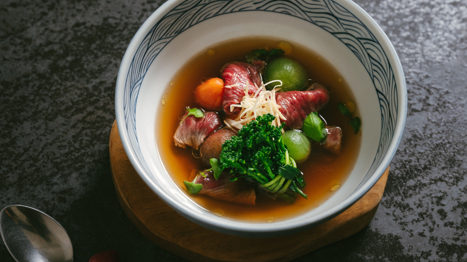 在烹飪節目「型男大主廚」擔任客座主廚的陳佑昇,不只在多家 Fine dining 西餐廳歷練,對中餐與臺菜更是嫻熟,也擅長將這些熟悉的老味道翻玩出新意。他設計的兩道炒菜與一道湯品,讓澳洲和牛成為平凡日常中的奢侈享受。