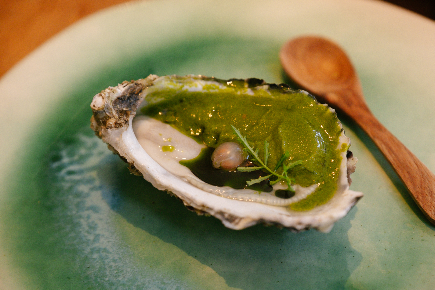 在生蠔上覆以一層受泰式蘸醬(Nam jim)啟發的青辣椒冰沙,並點綴冷杉松油,這是一場泰國風味與英國物產相遇的對話。