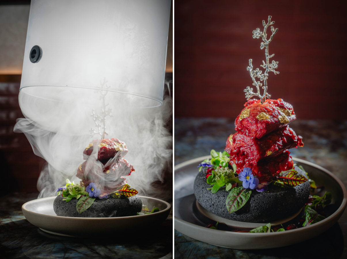 Justin 在 Golden Peacock 時期創作的招牌菜。選用巴西有機雞肉,以少量微微烤過的乾辣椒、芫荽籽、孜然等香料,帶出溫和內斂的辛香,刻意不追求濃烈風味。法國小甜菜根煮熟後與石榴汁打成泥狀醃製雞肉,取代傳統辣椒,使雞肉呈現自然紅色,同時增添淡淡的甜味。