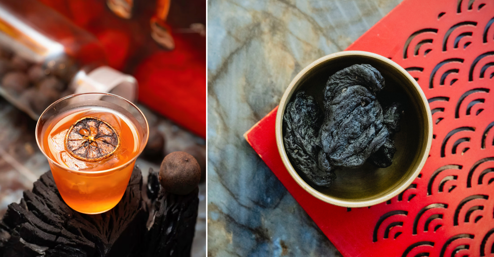 Justindia 的調酒師 Joseph 以經燻製和烘乾的黑青檸(Kala Nimbu)浸泡於梅斯卡爾(Mezcal),帶出濃厚的煙燻與甜酸氣息,令人聯想到香飯(Biryani)。左圖提供:Justindia,右圖攝影:Tommy Tang