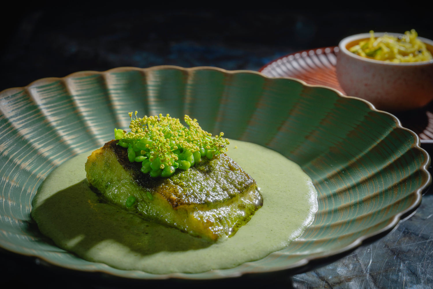 這是印度帕西族群(Parsi)的傳統做法。把香菜、薄荷、新鮮椰子、孜然、薑和蒜打成的香料醬,塗在魚柳上,用香蕉葉包裹蒸熟。在 Justindia 特別搭配以新鮮椰子和青辣椒打成的醬汁,和清爽的檸檬飯一起食用。