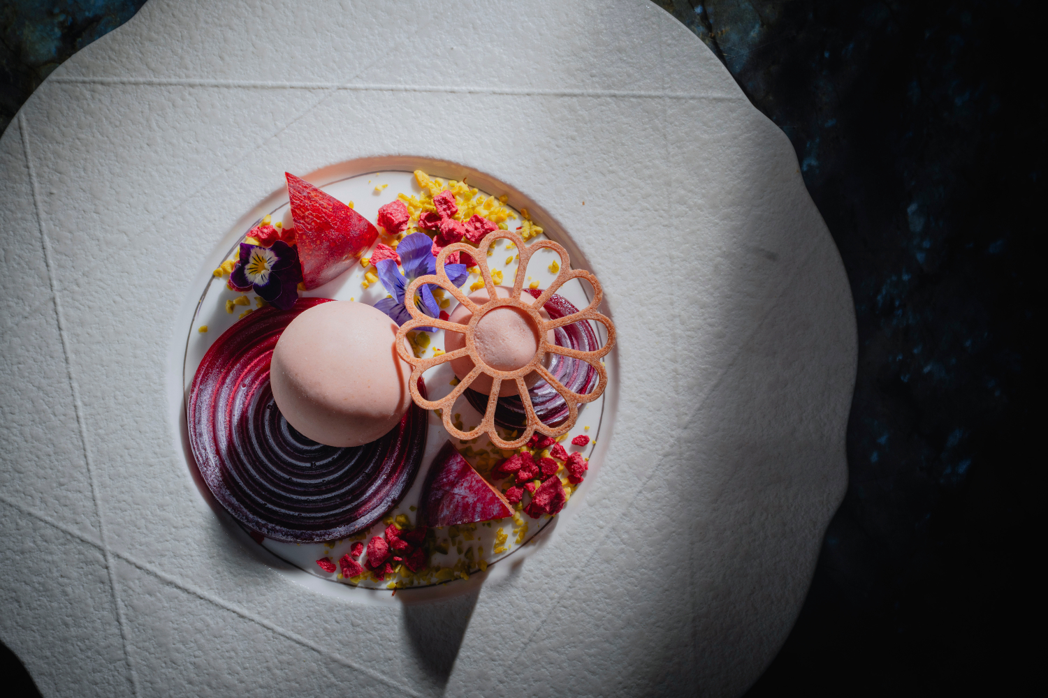慢煮濃縮北海道牛奶,以豆蔻提香,混合美國新鮮李子製作的果泥後冷凍成型。配櫻桃果凍、覆盆子脆粒和開心果,平衡牛奶的濃厚,同時增添層次口感,呈現如花園般的視覺效果。