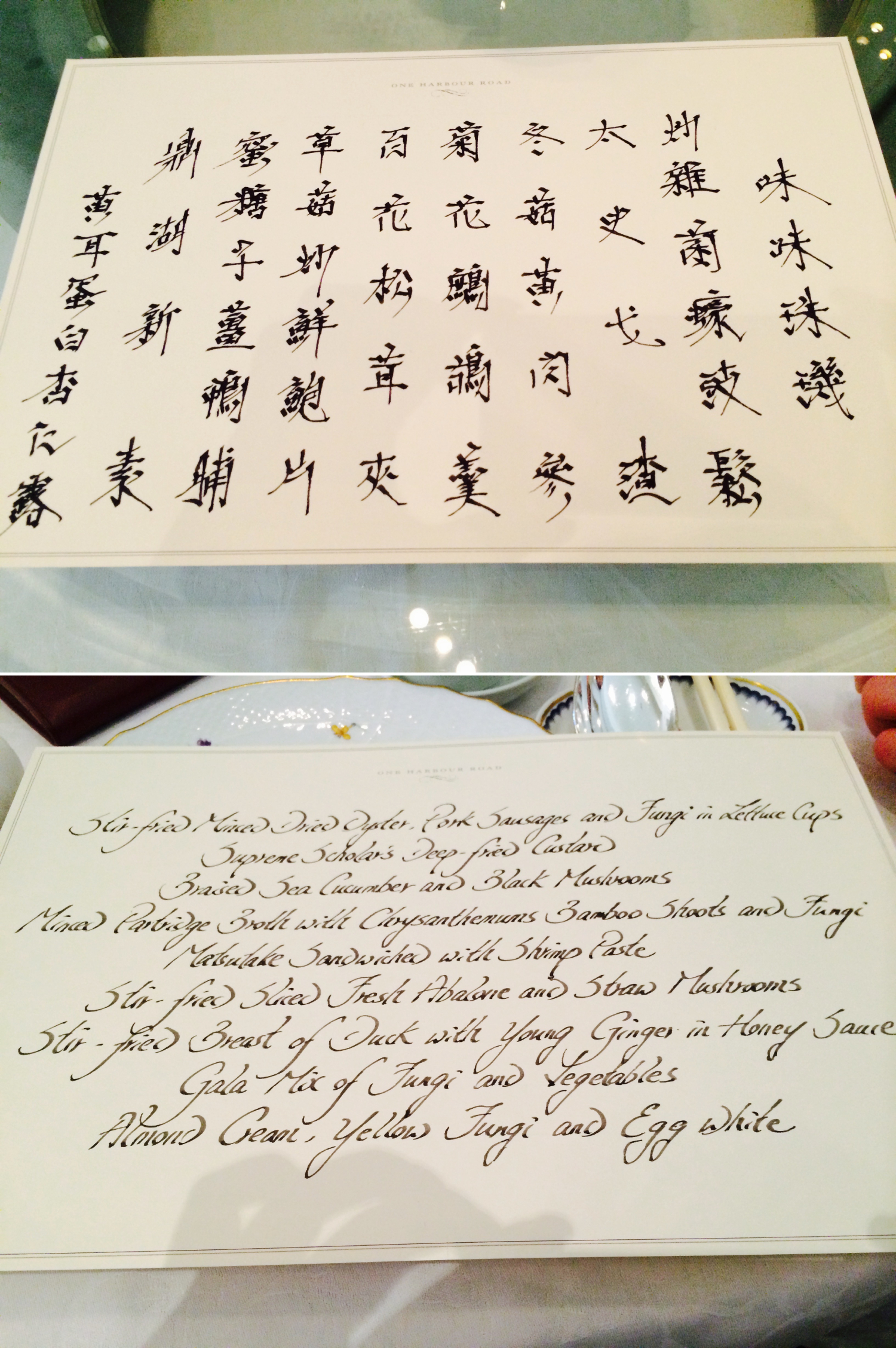 「字乃人之衣冠」,大戶人家的家宴,怎會沒有一張好看的手寫菜單?因為整套儀式是文化水平的體現。只是懂得吃吃吃,是暴發戶。當天的「珠璣宴」,在江獻珠她老人家的提點下,合作方港灣壹號也把好看的手寫菜單這回事辦到了。