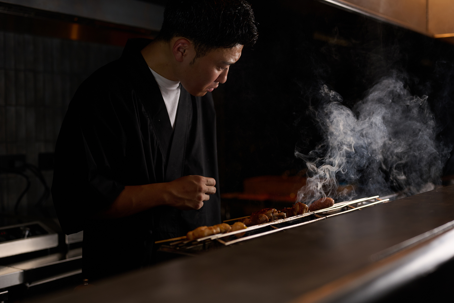 位於台北晶華酒店的 fumée,是大阪米其林一星「燒鳥 市松」首家海外姊妹店,它透過燒鳥演繹雞肉不同部位的風味及口感,並以割烹形式供應套餐。自 2023 年開幕後,fumée 立刻成為台北預約困難餐廳。每夜守在烤台前,在火焰和燻煙間俐落翻動燒鳥的,是年僅 25 歲的笠春介。