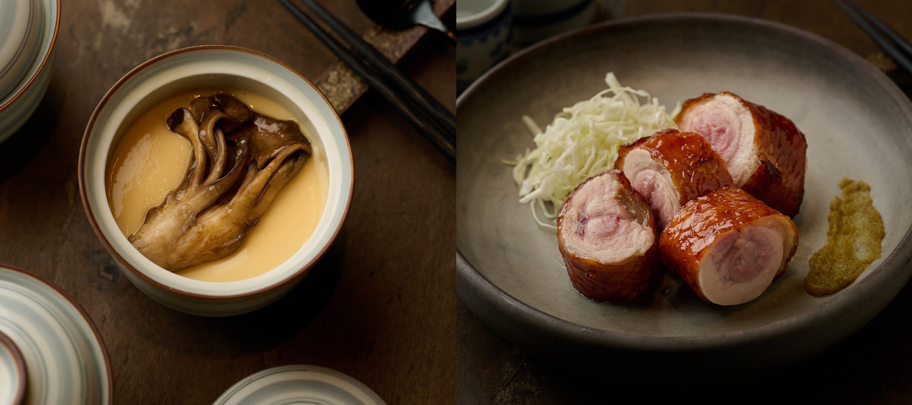 雞高湯茶碗蒸(左)碗底藏的莫札瑞拉起司與雞湯的鮮醇合拍。雞肉捲高麗菜沙拉(右)將雞皮烤出烤鴨般的脆感與風味,是笠春介為喜愛烤鴨的台灣人發想的料理。