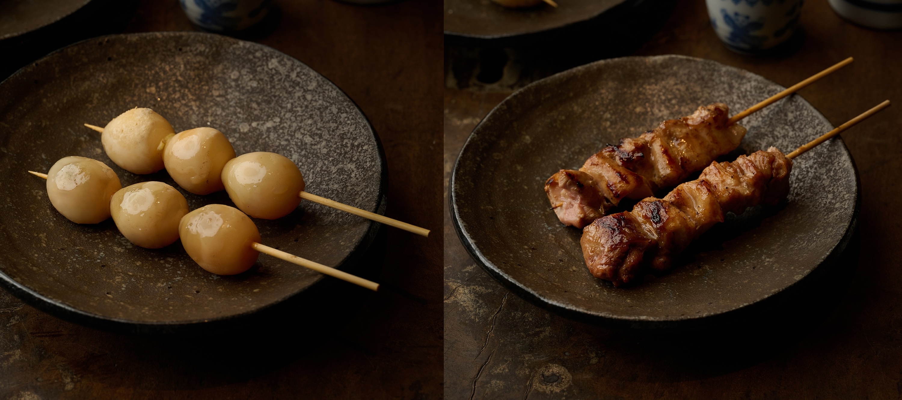 fumée 的雞腿串燒是由兩塊連皮雞腿肉組成,以鹽調味;inari 則是將尺寸較小的去皮雞腿肉串起,並由糖、清酒及洋蔥調成的醬汁帶出鮮甜醬燒滋味。笠春介說雞皮串燒是福岡的居酒屋名物,因此燒鳥串多半會取下雞皮,另外做成串燒。