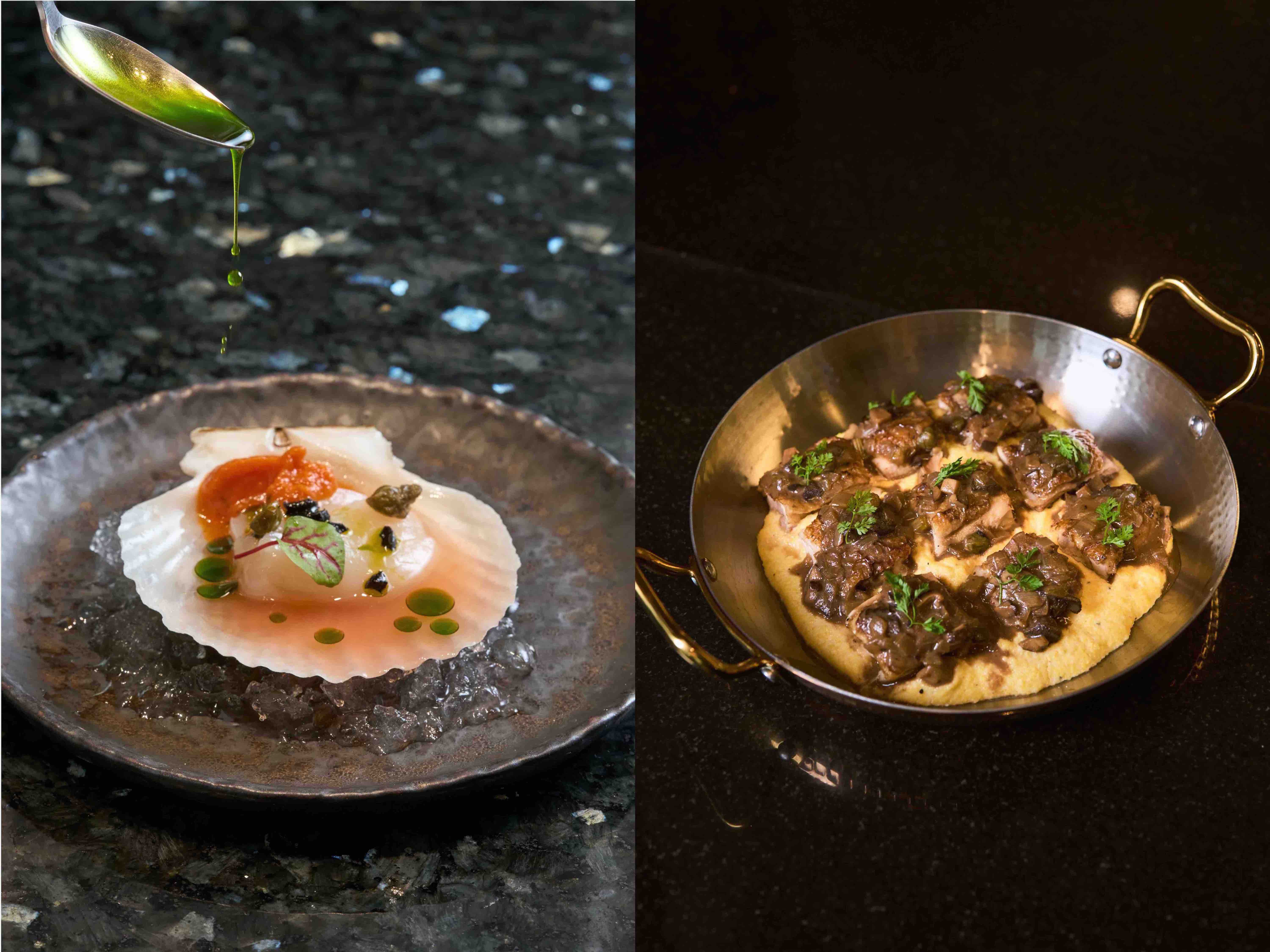 北海道扇貝佐澄清番茄湯(左)用果香與酸度兼具的番茄澄清湯襯托北海道干貝。獵人燉雞(右)將山林深處的木質氣息與菌菇濃香一併收攏。