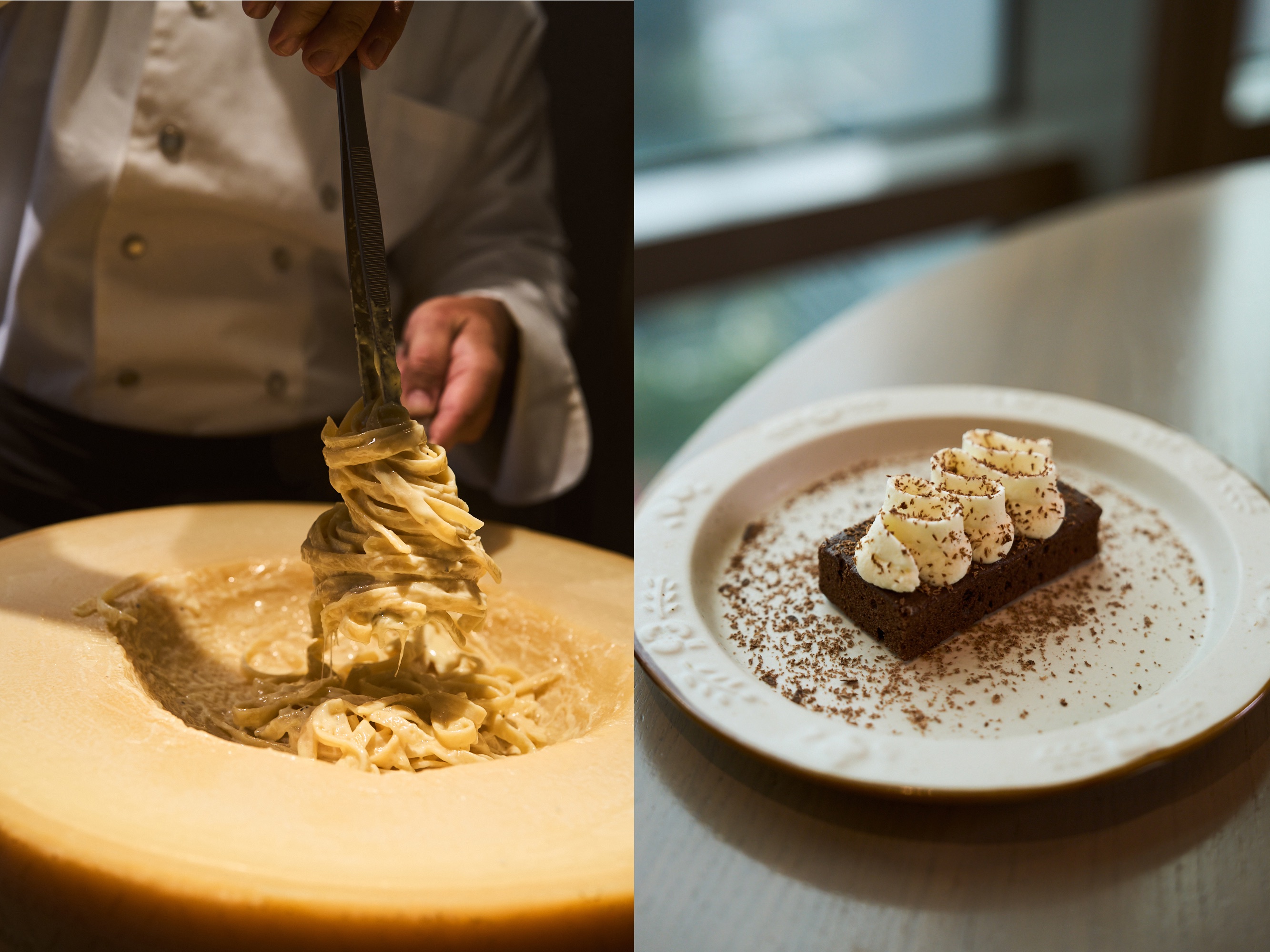 帕達諾起司義大利麵(左)將義大利麵放入熟成 18 個月的帕達諾乾酪中,讓濃郁起司在熱度中化作絲滑醬體,纏繞每一縷義大利麵。經典甜點提拉米蘇(右)在 Enrico 的詮釋下更加細膩。