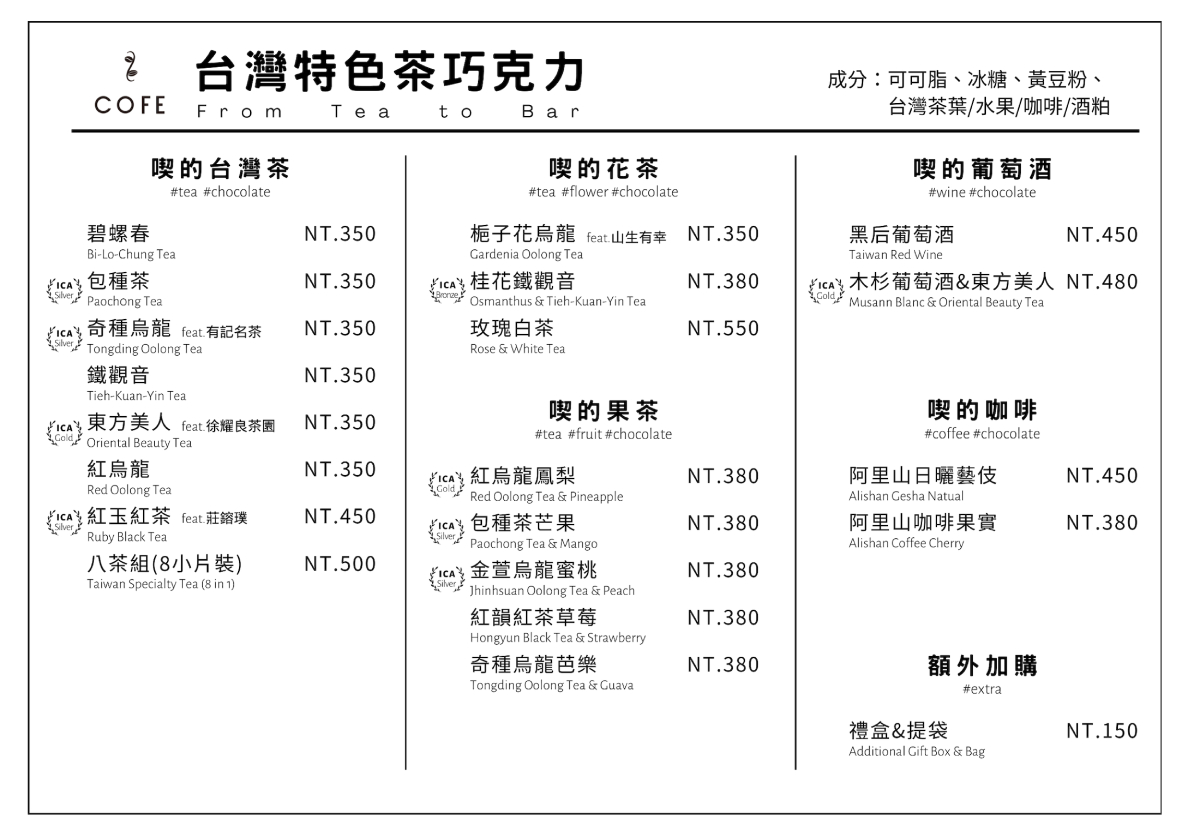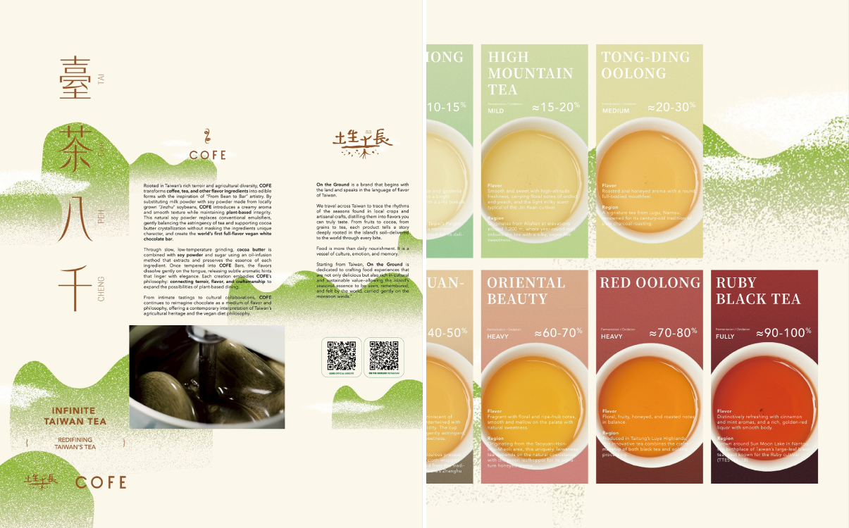 COFE 的茶巧克雖不含黑巧克力可可固形物成分,卻採用可可脂作為穩定台灣茶風味的媒介,同時添用國產金珠黃豆粉、蔗糖原料,創造出純素的茶巧克,開展全新的風味語彙。