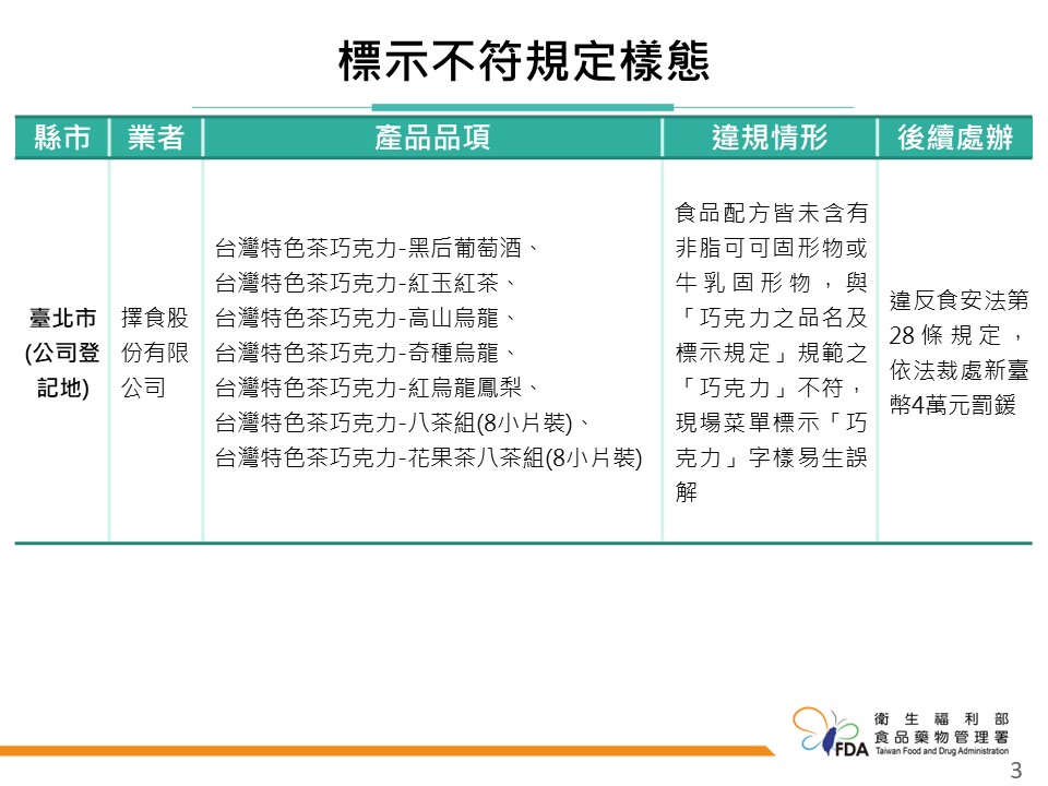 2025 年 8 月 14 日,衛福部食藥署公布「114 年度巧克力製品製造業稽查專案」結果,新聞稿中提到「擇食股份有限公司」有 7 款巧克力未含有非脂可可固形物與奶粉,店面現場菜單標示不符規定,裁罰 4 萬元。
