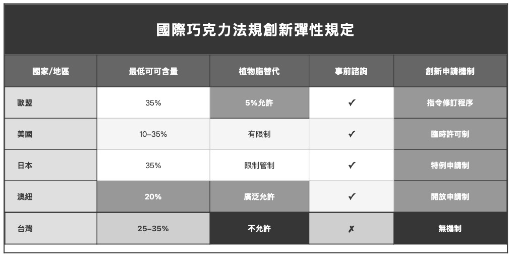 國際主要市場已針對巧克力這項食品在成分蛻變時所遭遇的產品標示問題,提出各種具體的解方,這證明了創新與法規能夠共存。
