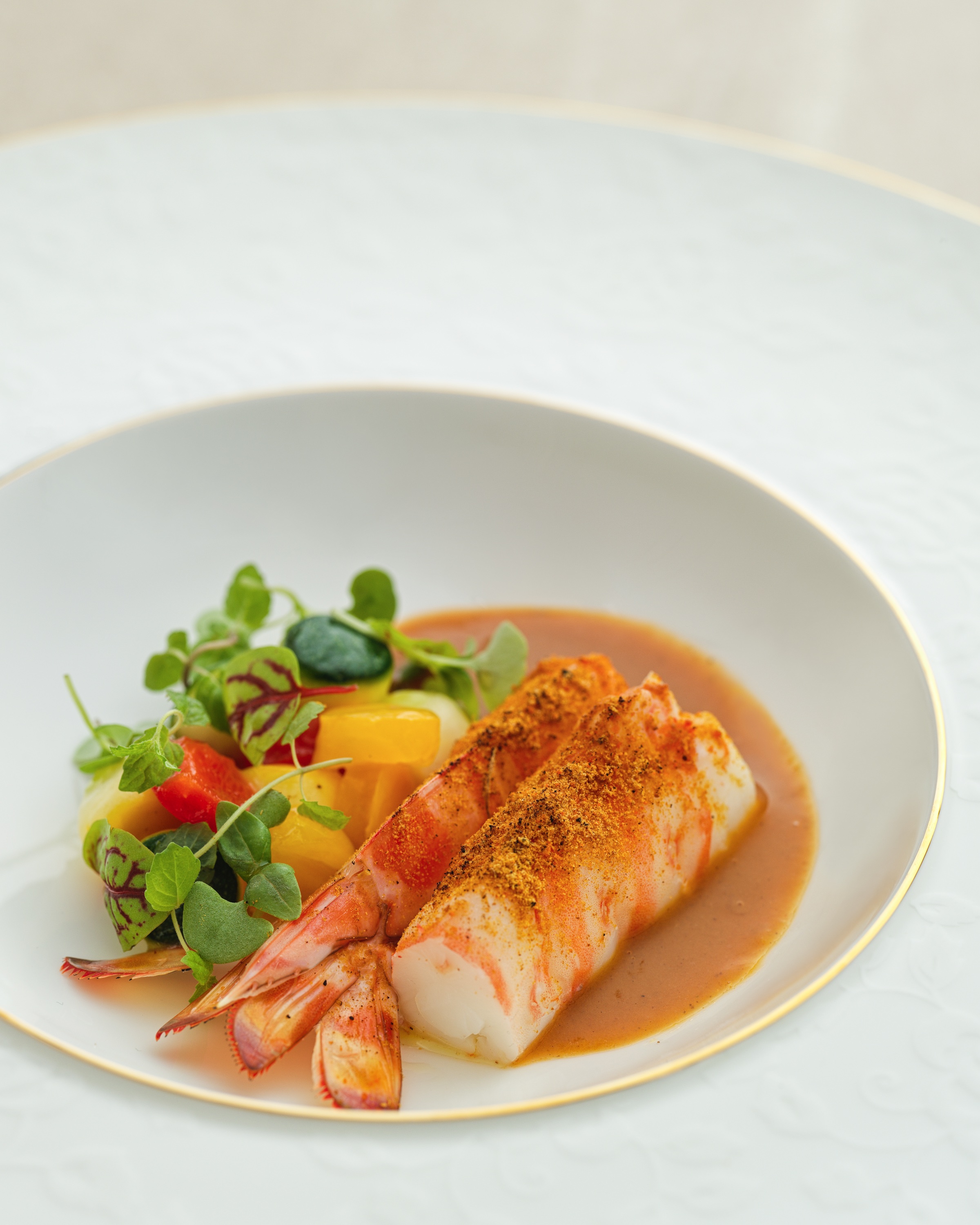 這道料理結合重慶火鍋與串串香兩種小吃的意趣。王國政以蝦湯和二荊條辣椒熬成宛如麻辣鍋湯底的醬汁,再點上糊辣紅油,加上灑在澎湖明蝦上的串串燒烤粉,三重香辣在味蕾和鼻尖不斷轉換,襯托出明蝦的鮮甜。