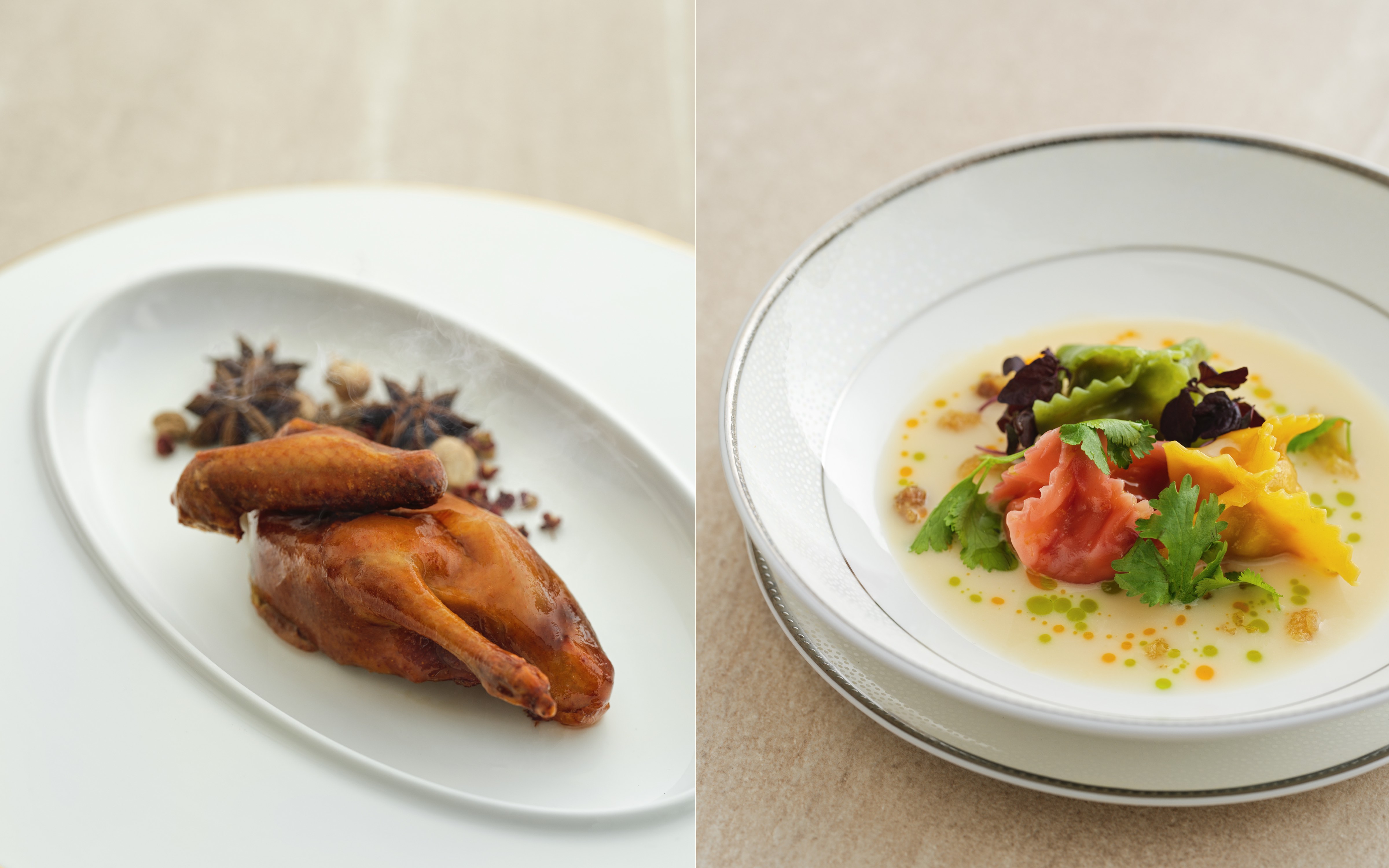 王國政以川菜 24 味型為基礎,再融入其它菜系的烹調手法和慣用食材,如「風味樟茶乳鴿」(左)用了粵菜常見的乳鴿,「剁椒魚餃子」(右)則有湖南剁椒的香辣。
