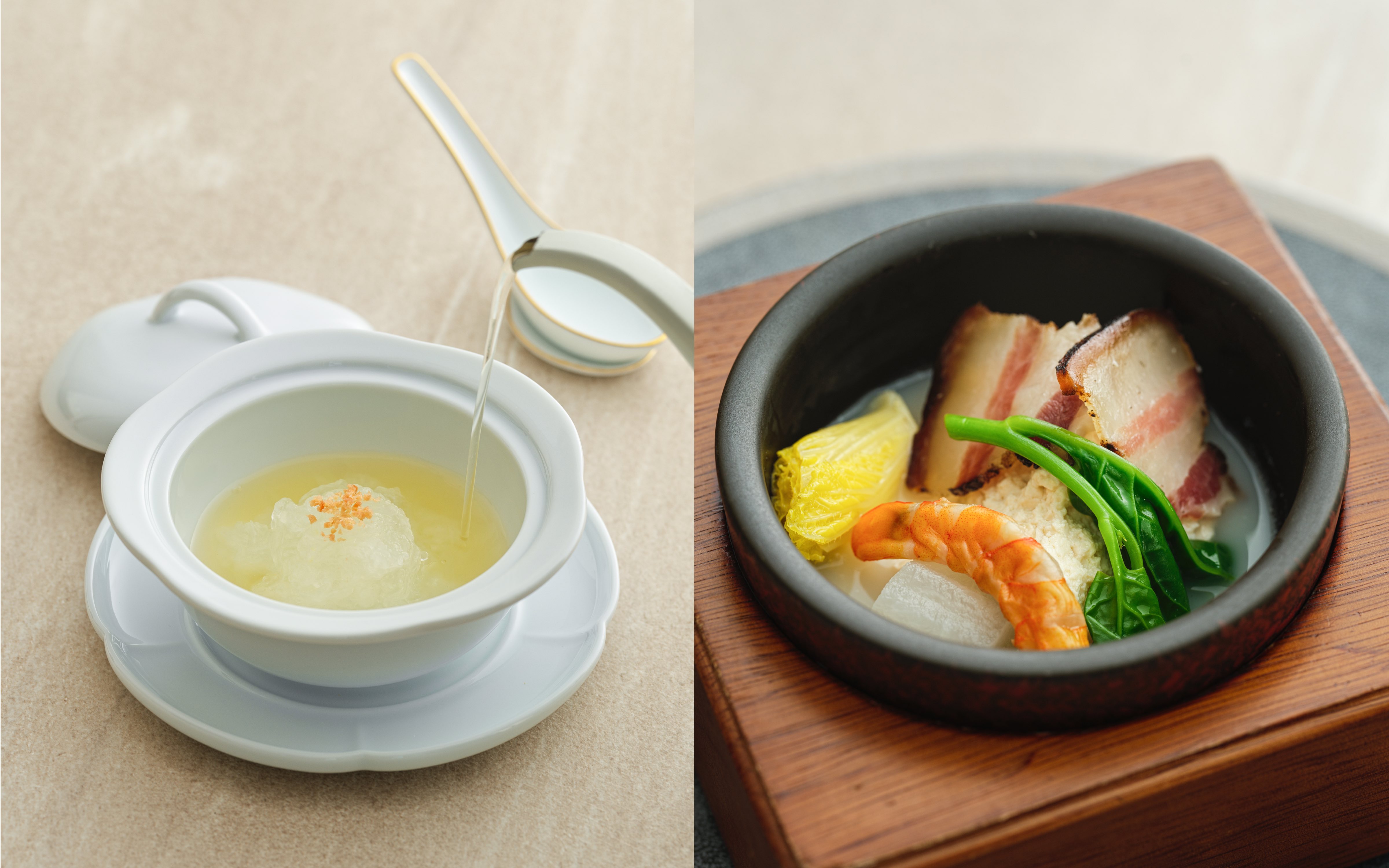 「清湯瓜燕」(左)狀似燕窩卻非燕窩,湯清如水卻味濃鮮醇,展現官府菜的講究。「奶湯海米臘肉燒豆腐」(右)將粗菜細作,用嚴謹工序傳遞農家菜的單純溫暖。