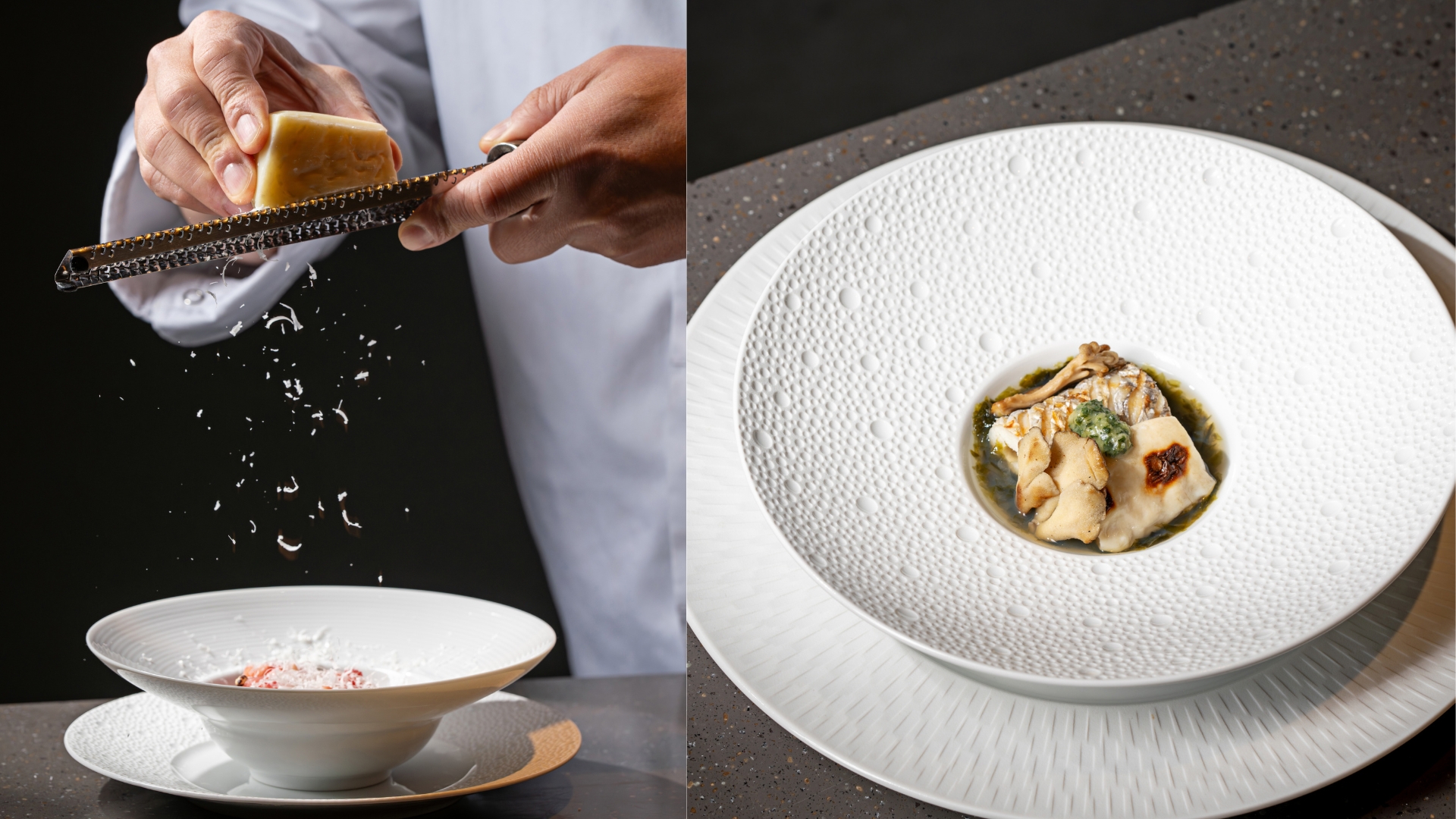 (좌) ‘일식 셰프가 선보이는 양식 요리’란 컨셉트 아래, 치즈와 버터 등 서양의 식재료를 적극 활용해 다양한 방식으로 풍미의 깊이를 확장해 나가고 있다. (우) 정성 들인 디시는 고급 양식기에 담아내지만, 테이블 위에 정갈하게 놓인 젓가락으로는 디시의 뿌리와 정체성을 또렷이 드러낸다.