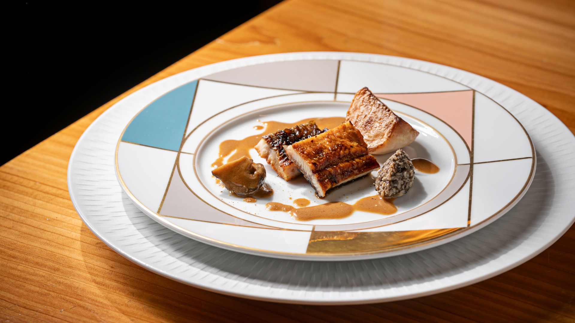숯불에 구운 민물 장어와 순무 구이 위로 양송이버섯 뒥셀과 표고버섯 레드 와인 간장이 더해지고, 다양한 과일로 끓여낸 버터 소스가 풍미에 레이어를 올리면서 깊이를 완성한다.