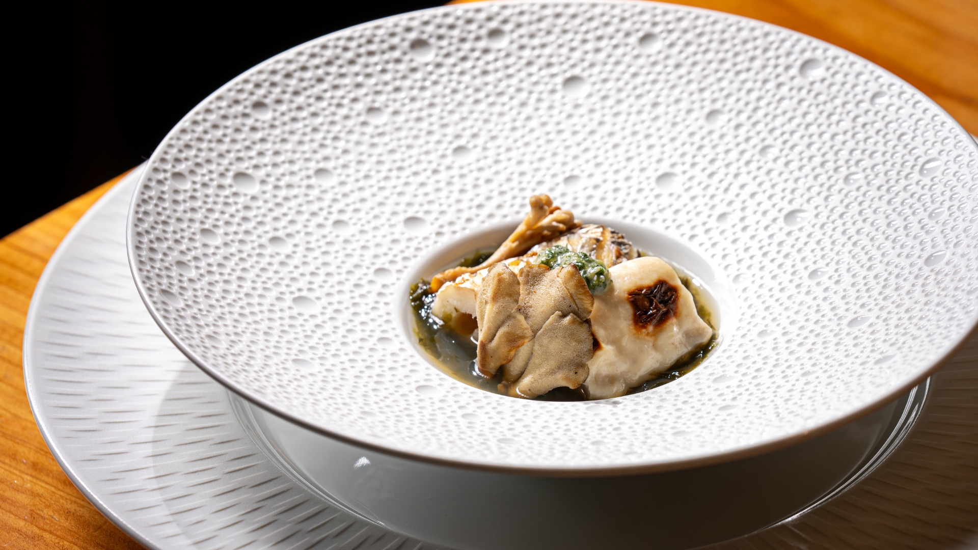 구운 갈치와 복어 이리 위로 건보리새우와 밴댕이, 멸치, 김으로 우린 다시가 더해지고, 마지막으로 잎새버섯이 전체적인 맛의 결을 정리해 준다.