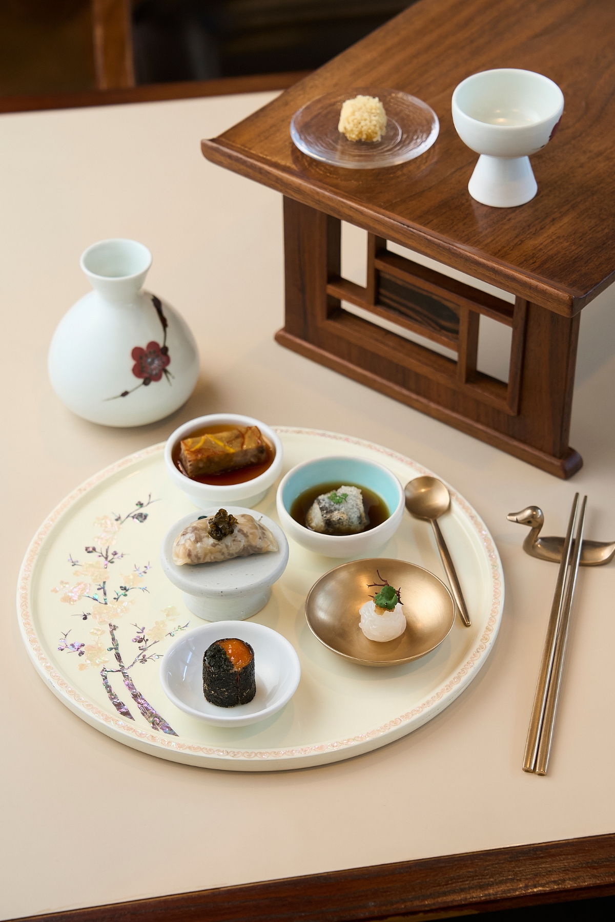 권숙수의 음식은 모두 낮은 소반 위에 오른다. 크고 화려한 테이블 대신 단정한 소반을 고집하는 건 한식을 ‘코스’가 아닌 ‘개인의 식사’로 만들고 싶은 권우중 셰프의 마음가짐 때문이다. 여기서 식사의 시작을 알리는 건 주안상이다. 각각 독립적인 요리들이 한 상에 오르며 산미와 육향, 발효의 잔향이 리드미컬하게 뒤엉키면서 조화롭게 어우러진다.
