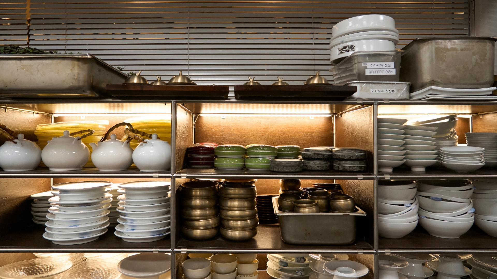 (좌) 권숙수의 ‘미래 프렙’은 시간을 공들여 쌓아올리며 완성도를 최대치로 높이는 가장 근본적인 경쟁력이다. (우) 권우중 셰프의 그릇장엔 그의 취향과 감각이 깊이 스며들어 있다.