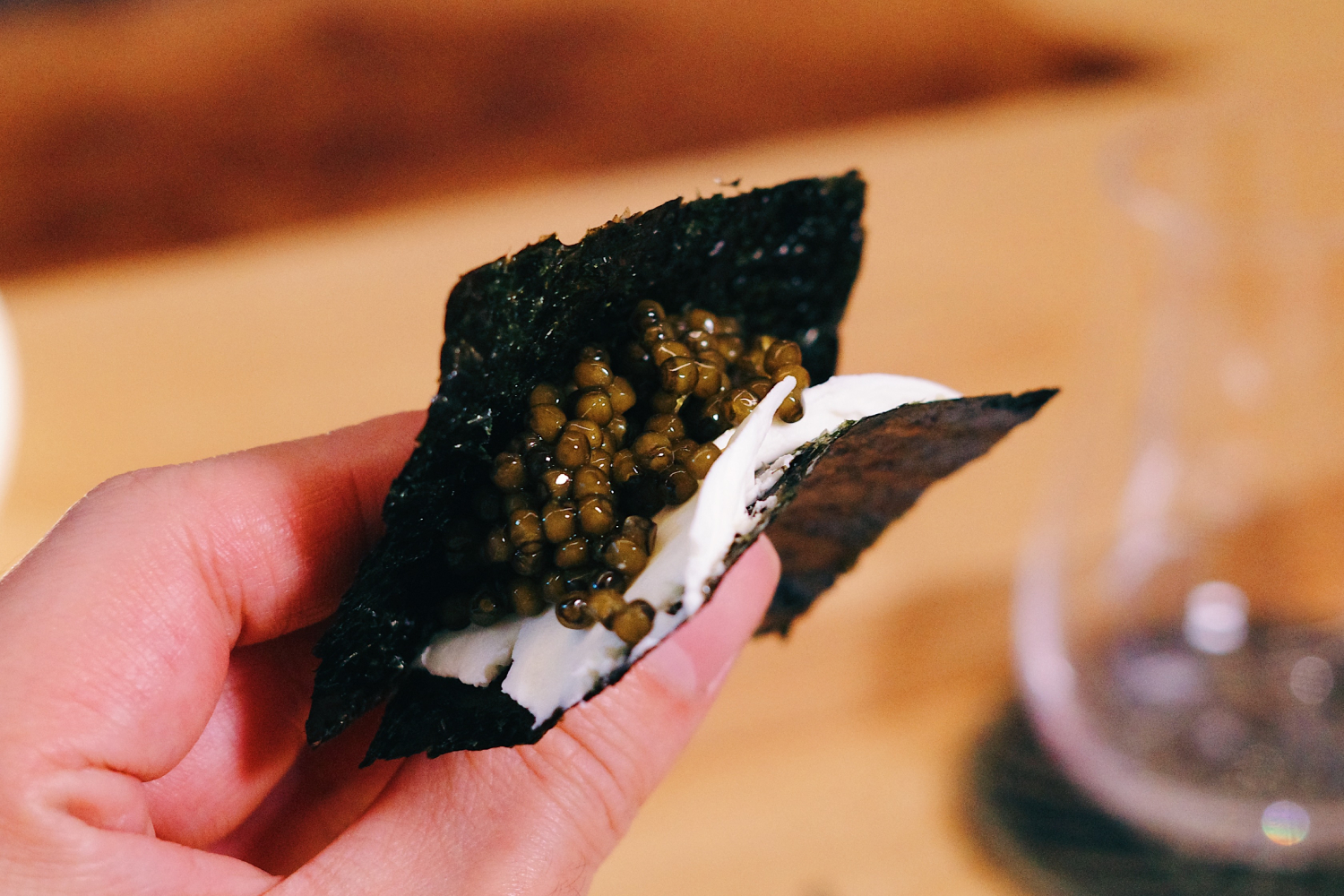 坐在板前吧台,眼前的日料師傅從容地烘烤海苔,現折一貫手卷(Temaki)。再熟悉不過的日料場景,咬下一口,裡頭卻非預期中的鮪魚或海膽,而是一大塊法國諾曼第的布里亞薩瓦蘭起司(Brillat-Savarin)佐以閃亮的魚子醬。
