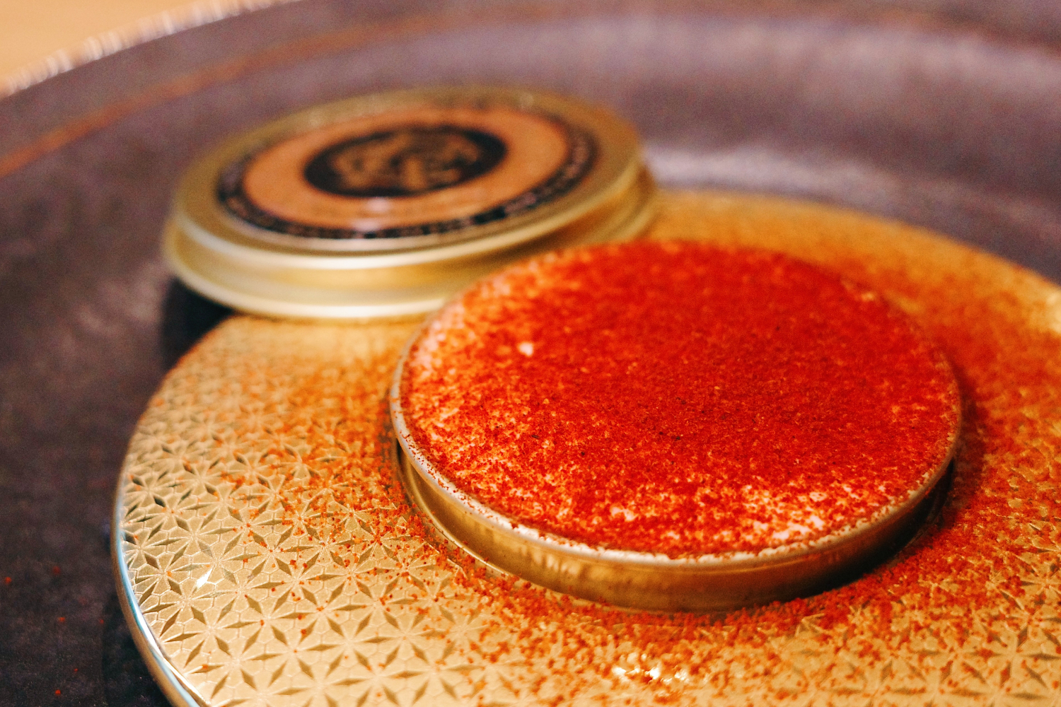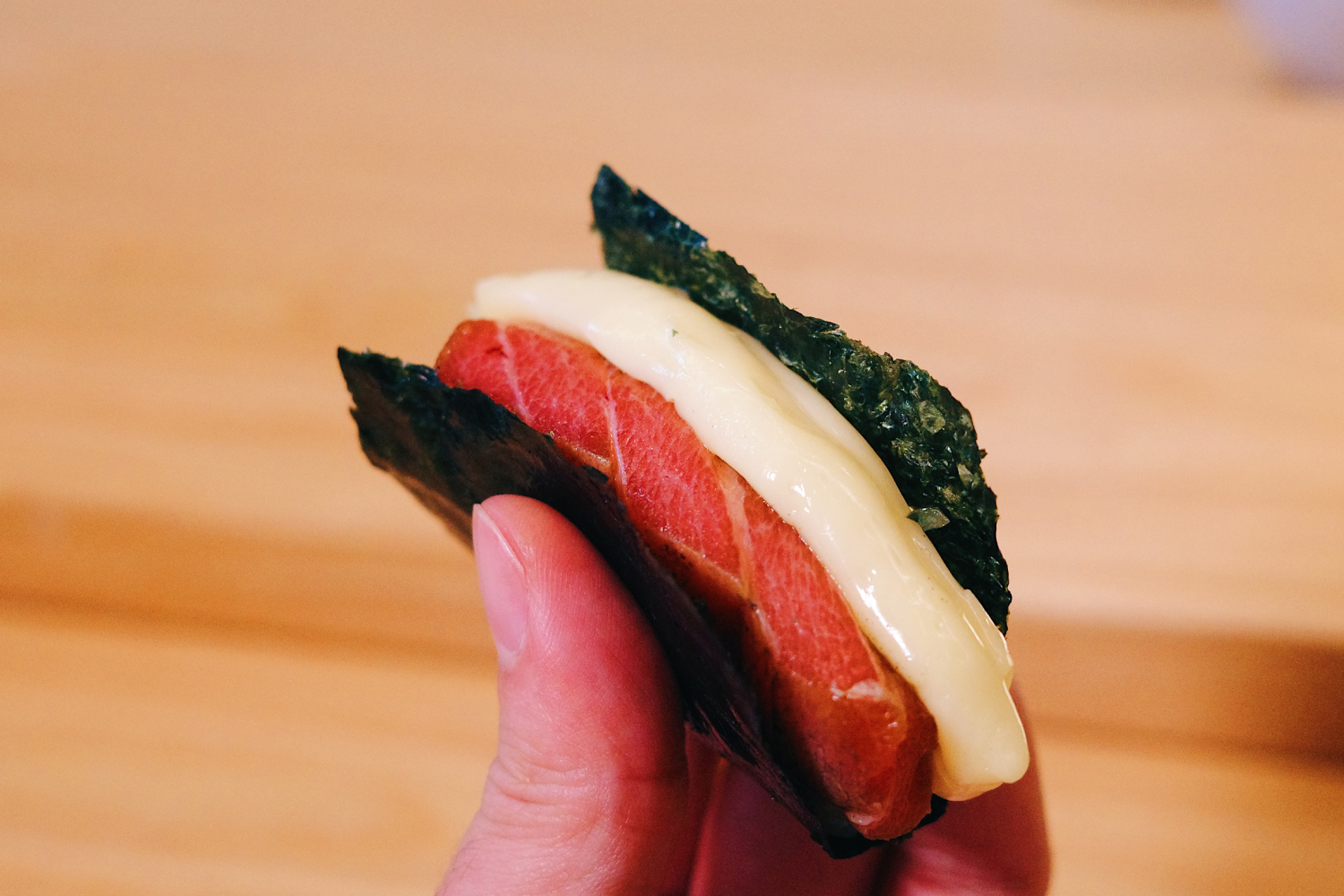 卡芒貝爾與鮪魚本是法式料理的經典搭配,但日籍主廚石橋至人將其轉化為壽司形態──鮪魚以備長炭灸燒,置於紫蘇壽司飯上,疊上一片絲滑黏稠的卡芒貝爾,再用烤海苔包成手卷。