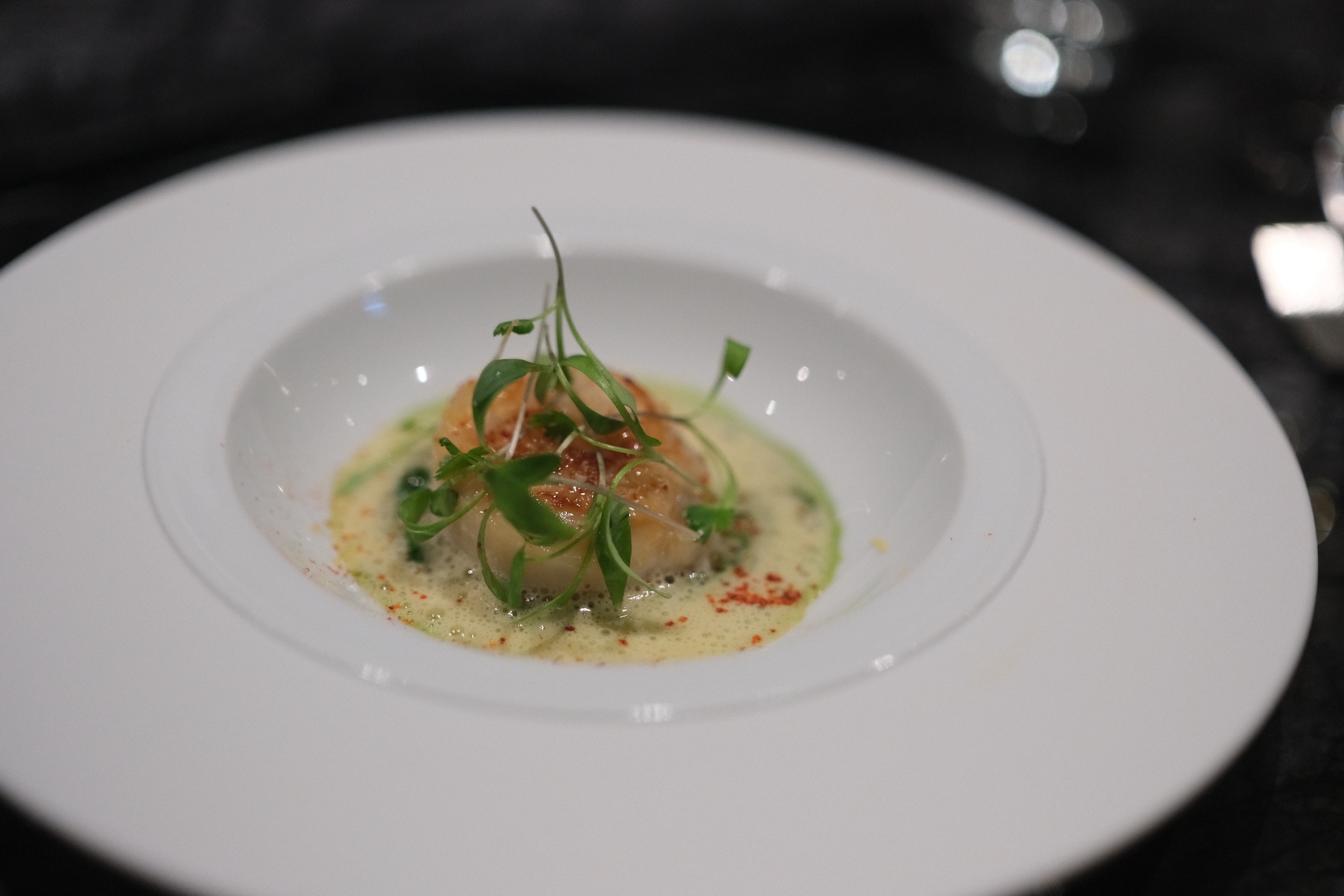 海鮮前菜選用大尺寸北海道干貝,搭配 Pacojet 做出的菠菜泥(Purée)與堅果奶油醬,點綴上香菜苗,濃郁醬汁中飄散香草氣息,鮮甜可口。