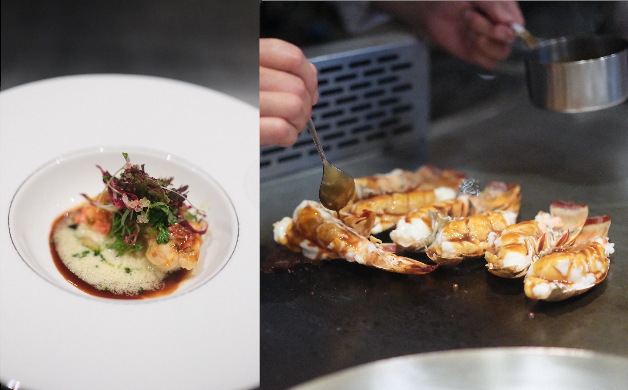 鐵板炙烤龍蝦時淋上精心濃縮的龍蝦汁,醬汁加入蒔蘿油與手指檸檬。