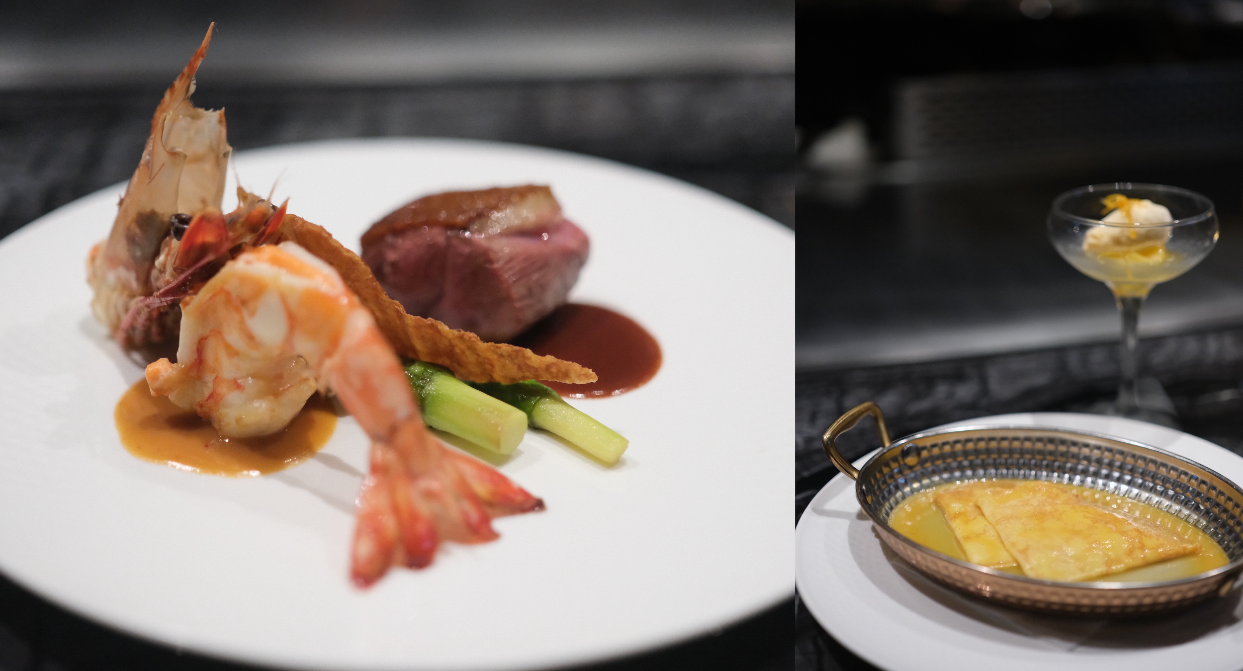 「櫻桃鴨胸|炙燒大明蝦」(左)是夏慕尼的招牌菜色,搭配 David 調製的兩款醬汁。「橙香可麗餅|香草冰淇淋」(右)為餐會畫下完美句點。
