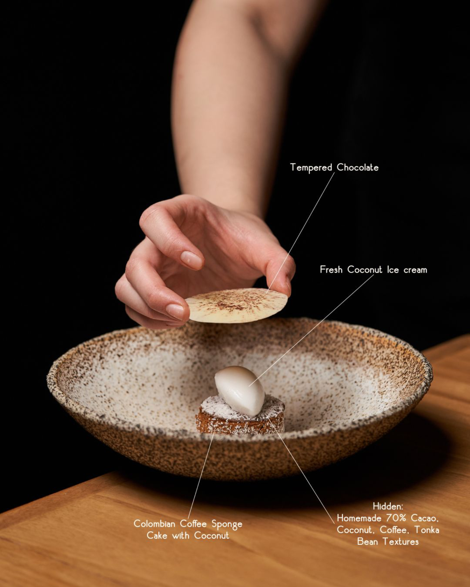 招牌甜點以自製的巧克力為核心,靈感源自經典的摩卡,巧妙地融入椰子和咖啡元素。熟悉的味覺享受與陌生的口感層次,是風味的完美結合。