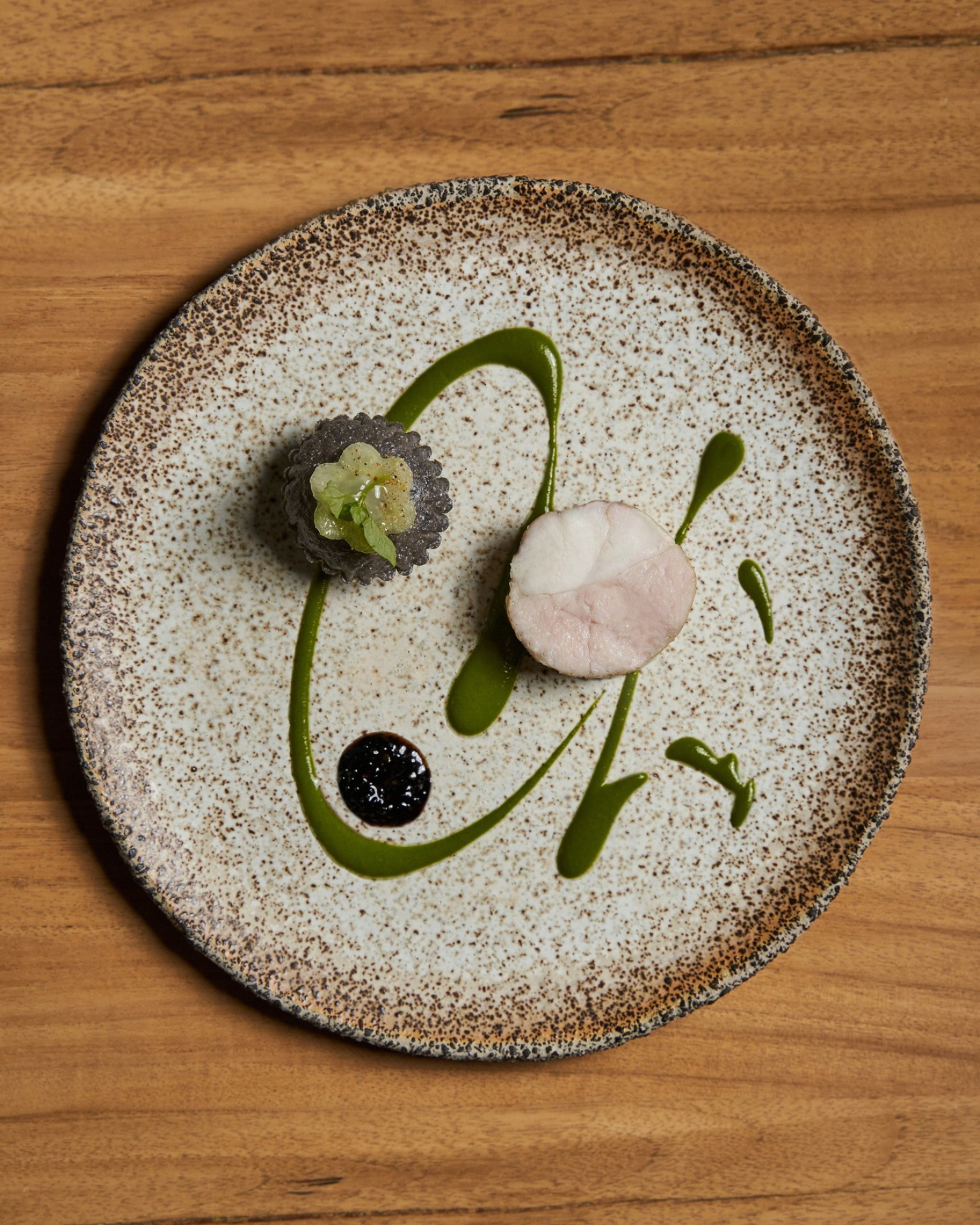 Monkbread 將小牛胸腺與鮟鱇魚結合,靈感來自 Ricardo 的童年回憶與委內瑞拉傳統。搭配手工紫玉米粉製成的酥脆玉米餅(Crispy Arepa),將風味與記憶交融。輕咬開脆殼,便是細膩的鱈魚蓉餡料,銜接起 Monkbread 的油潤與甘甜。
