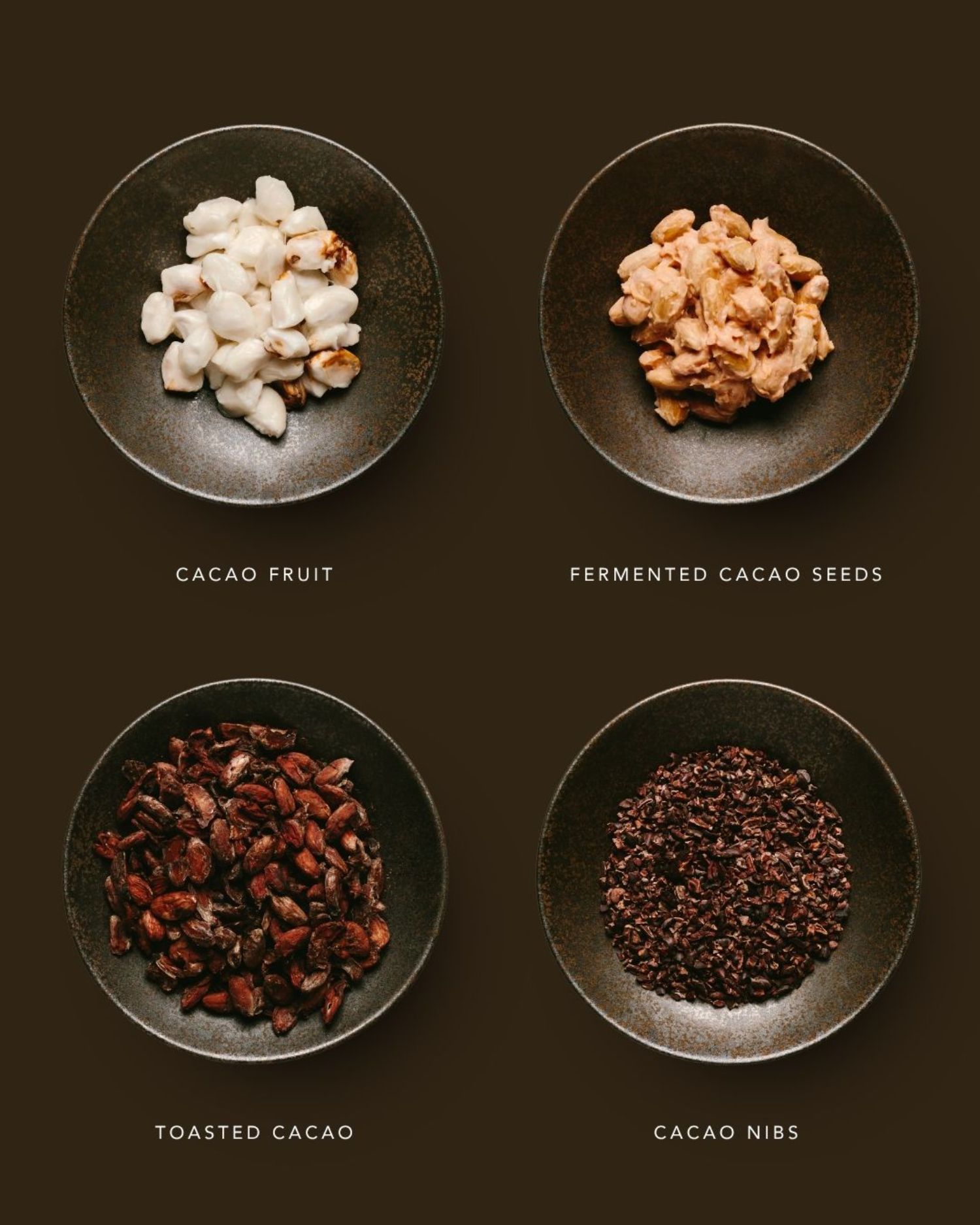 - 5. 研磨:豆粒的蛻變。烘焙後的可可豆,外殼變得脆硬,易於去除。剝去每個外殼,露出裡頭的可可碎粒。