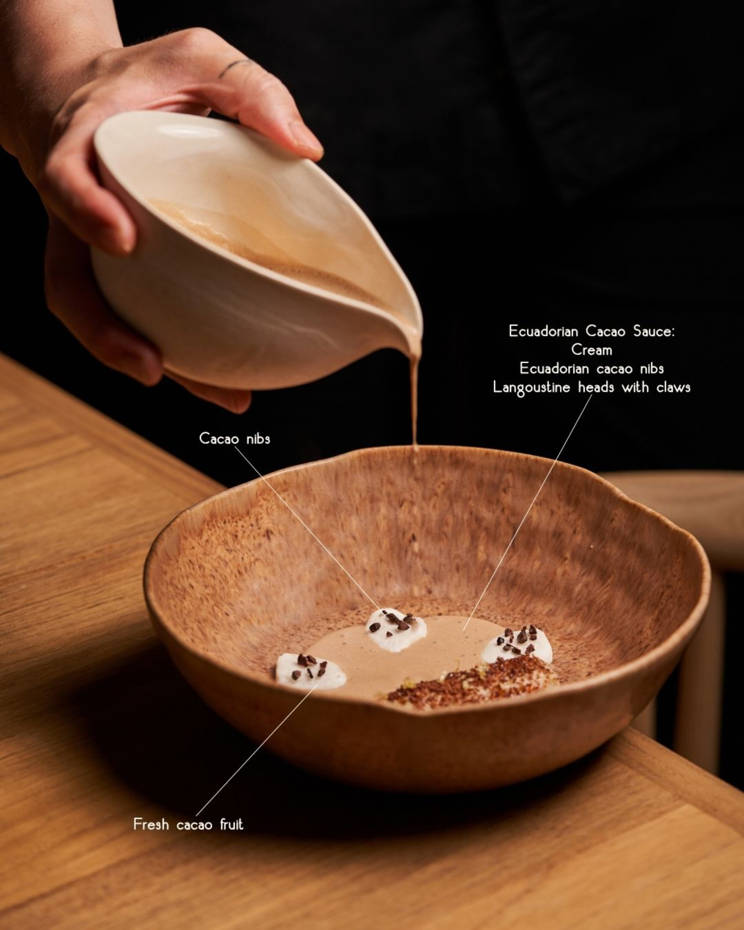 這道可可與海鼇蝦的結合,是菜單上的常客;每個階段的可可擁有不同的風味,略微煎製的丹麥海鼇蝦,最後淋上由海鼇蝦頭和可可製成的醬汁。