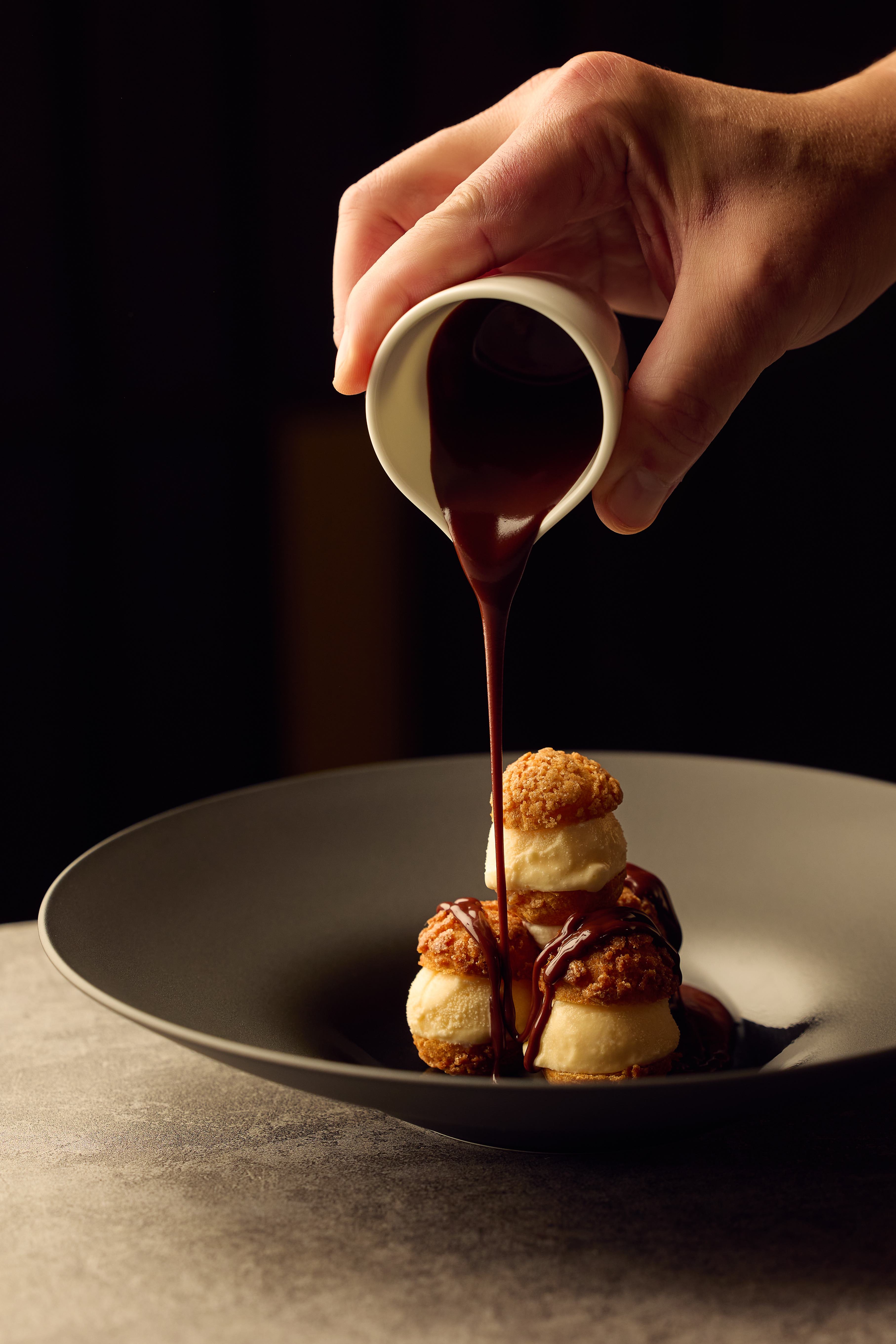 「香草冰淇淋泡芙」在桌邊淋上溫熱濃稠的法芙娜 Manjari 64% 巧克力醬,讓冰涼與炙熱、甜蜜和苦韻在盤中相遇。