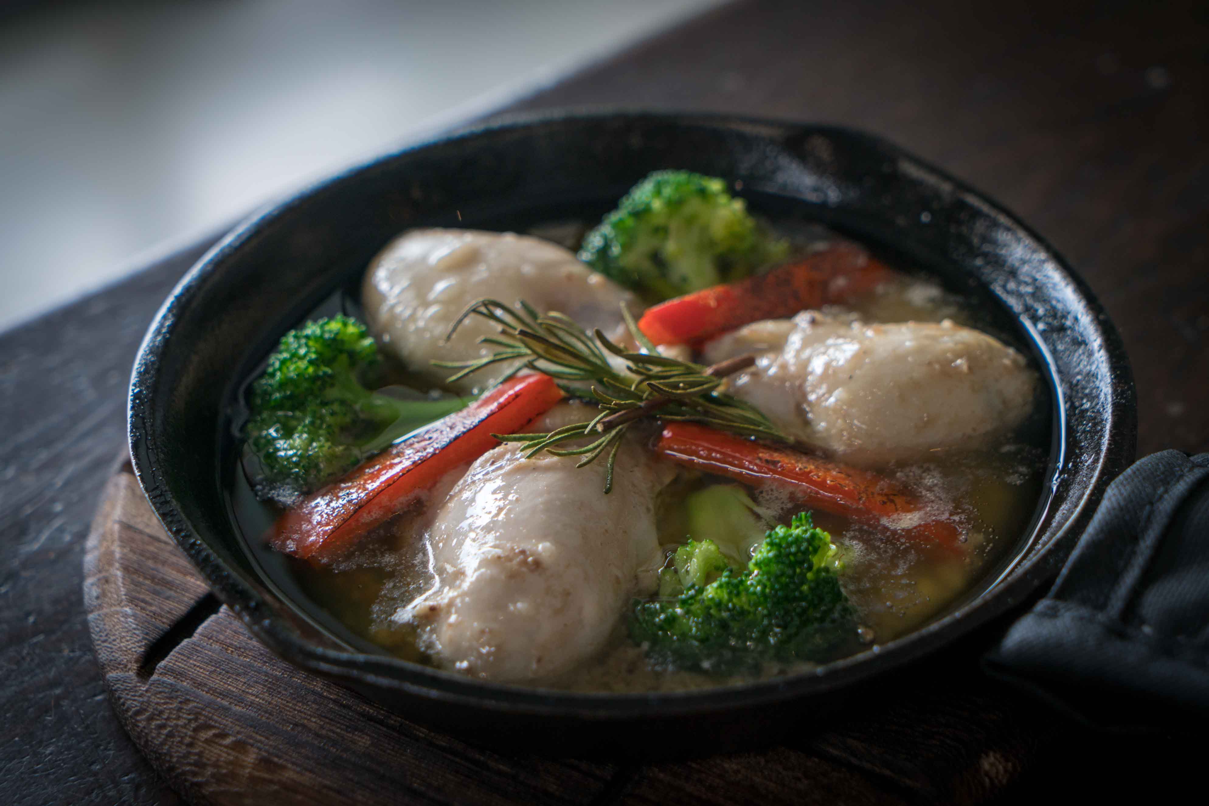 嶼我的平日菜單提供招牌烤魚,將自家熟成的魚烤得皮脆肉嫩,搭配香草醬汁與橄欖油,微微歐陸風情詮釋在地優質魚鮮。嶼我另外一個特點是備有「鐵板」菜式,兩人說明,基隆的天氣容易溼雨,這時候來個保溫炙熱的鐵板料理,特別溫暖人心,同時這也是 Penny 童年的家庭料理回憶,母親總在冬日端上像牛排館的漆黑鑄鐵盤料理,讓菜上桌後保持滾燙,讓她回味不已。在鑄鐵盤裡豪氣用上大量橄欖油、鯷魚搭配鮮甜日本巨大牡蠣,單吃、蘸麵包皆宜。