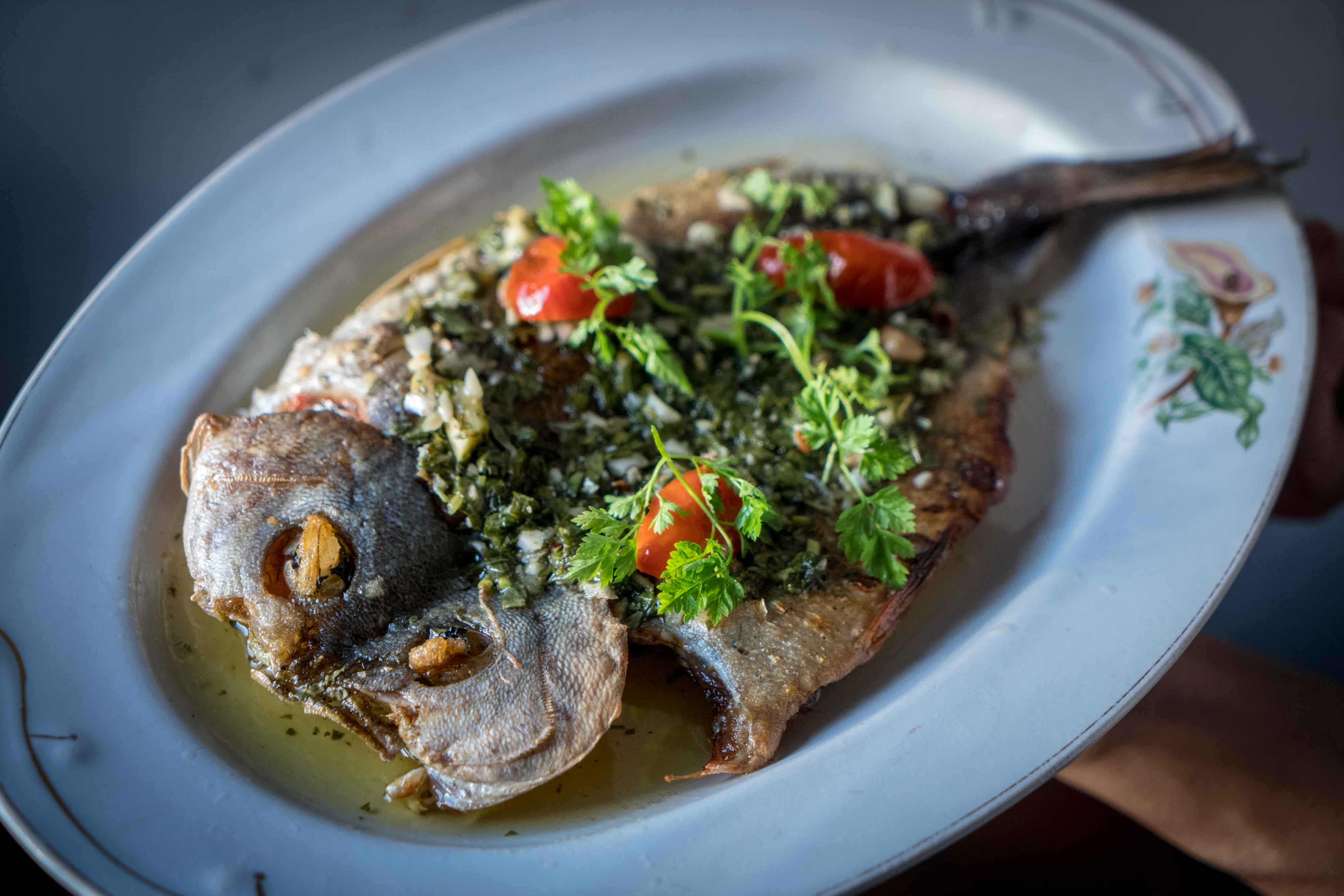 「招牌熟成烤魚」將熟成鮮魚烤得皮脆肉嫩,搭配香草醬汁與橄欖油,以歐陸風情詮釋在地優質魚鮮。圖片提供:嶼我