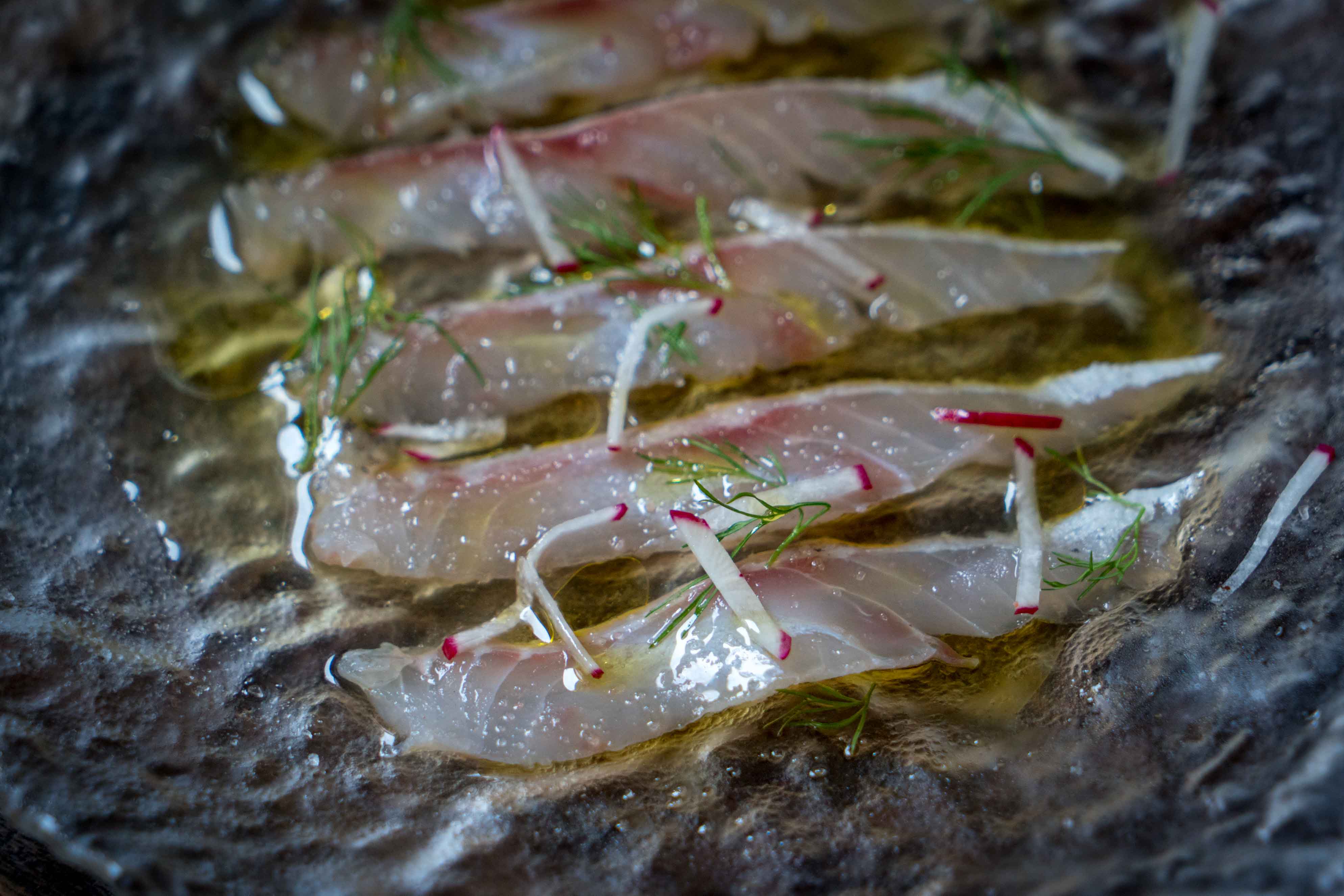 熟成魚生魚片搭配香草以及橄欖油,這樣的料理讓小漁港餐館散發宛如南歐的氣息。圖片提供:嶼我