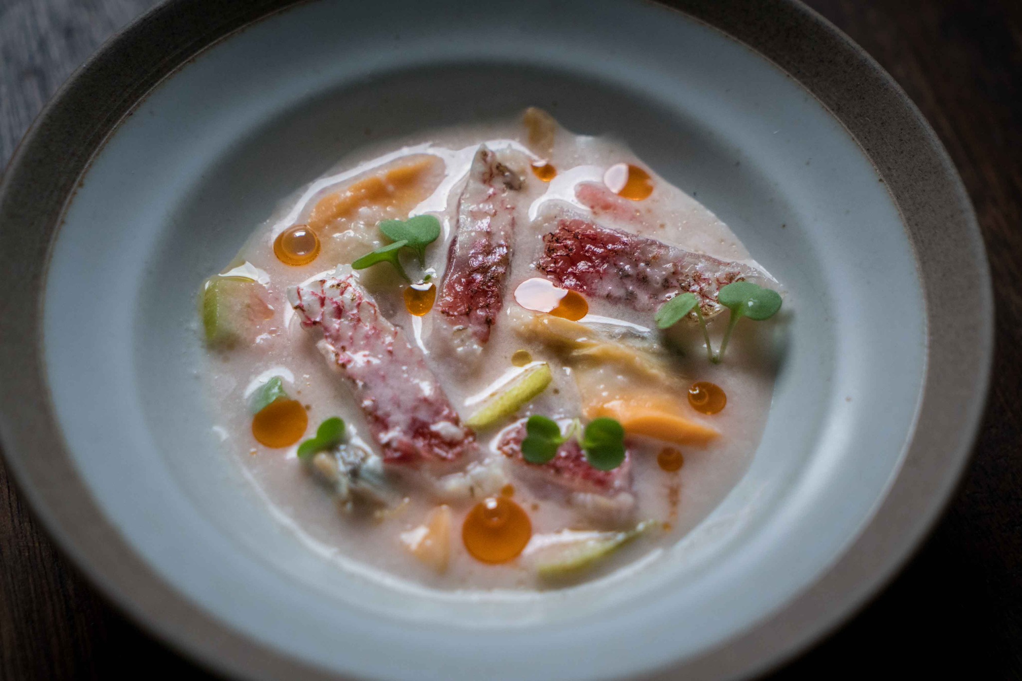 她將長尾鳥熟成 4 天後,用秘魯經典菜色 Ceviche 酸熟手法「冷煮」,製作成「老虎奶」。白肉魚在果酸中熟成,老虎奶湯汁(Leche de tigre)以屏東檸檬跟魚湯打底,再加入自家酸豆與番茄油,搭配黑金剛海瓜子與大溪生食級胭脂蝦,甜鹹酸香相互成就。令人印象深刻的前菜,湯汁都想喝光!