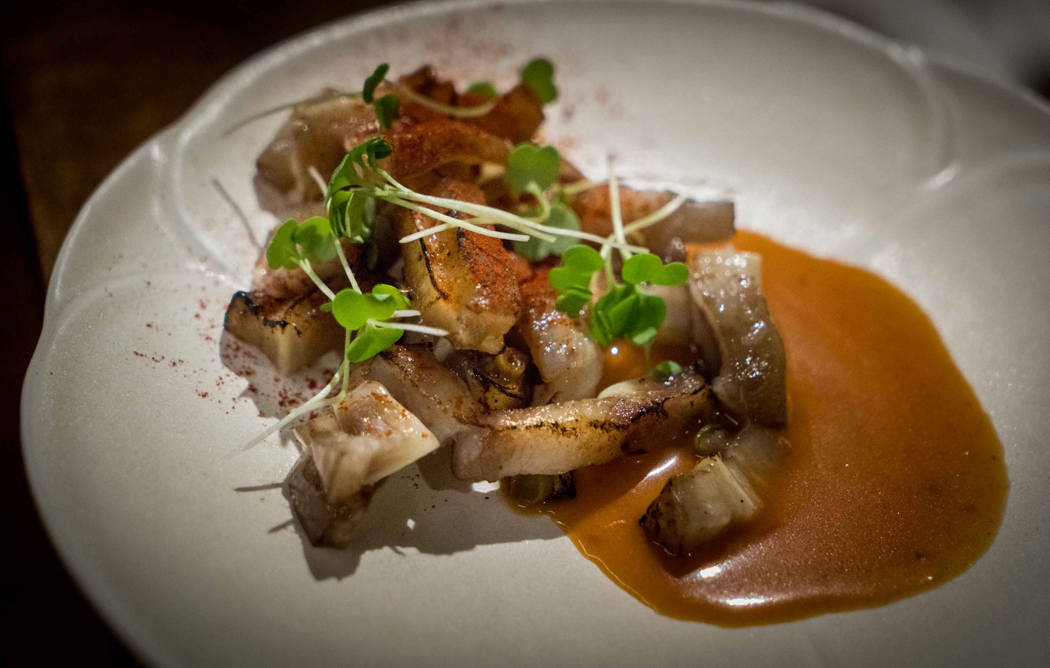 Penny 從小就有「以黑豬為美」的在地口味。融合西班牙旅行經驗以及基隆在地小吃味蕾,她選用桃園平鎮的「大黑豬」,以香草慢火燉煮,釋放溫柔膠質口感與清脆軟骨,再放到烤箱炙烤帶來邊角焦香。調味上用燉湯的豬高湯為底,調入帶有味噌成分的基隆在地丸進辣醬,撒上辣椒粉,口感、風味層次都十分精采。