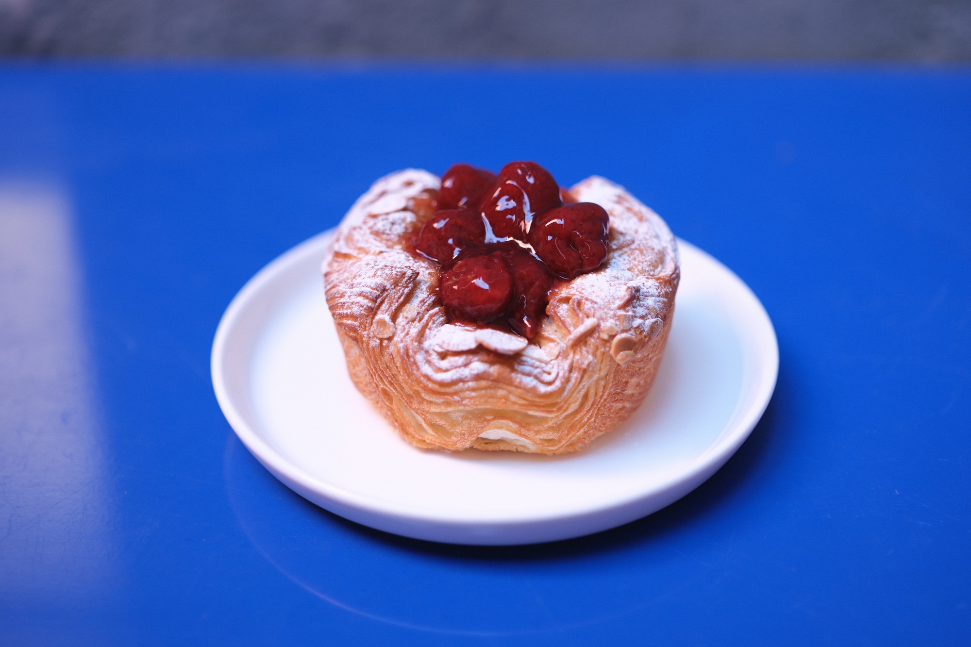 素酥皮塑形成杯後,放上櫻桃果醬的丹麥麵包。