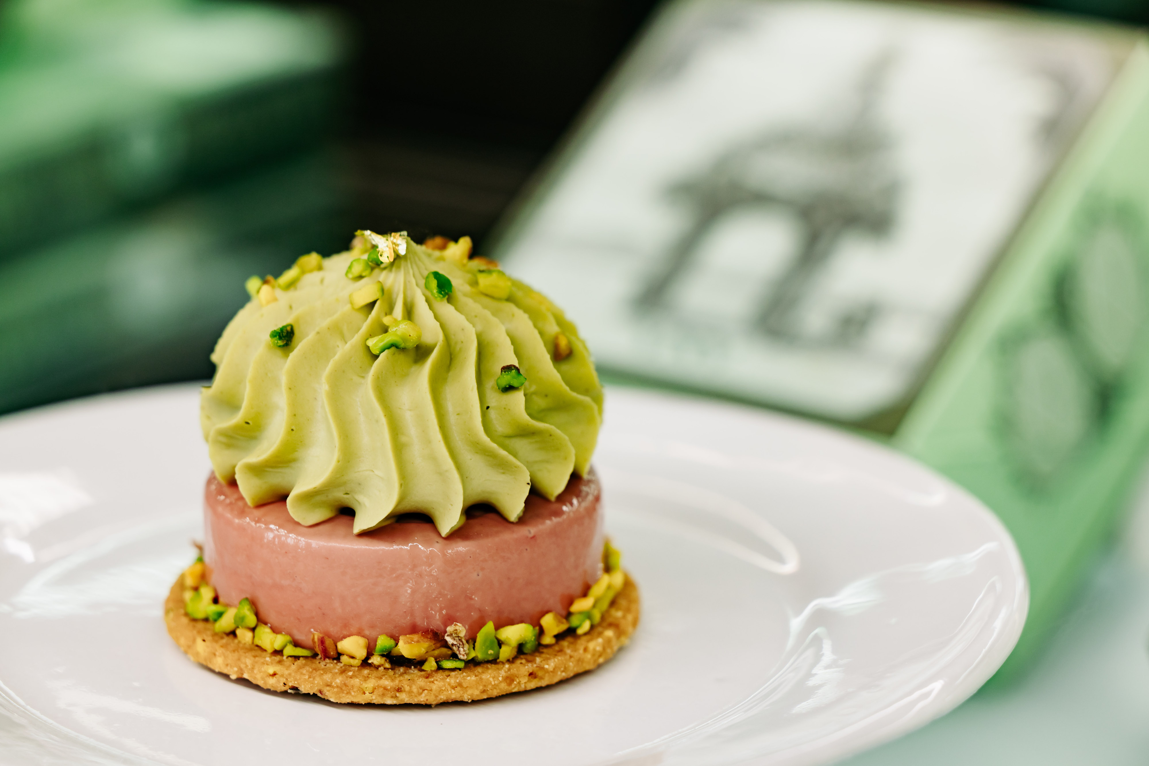 「La Sicile 西西里」是一款粉綠跟粉紅結合的作品,色系呼應空間設定。使用產地認證的西西⾥開⼼果香緹(Crème Chantilly)、覆盆莓法式奶油醬、覆盆莓果凝,搭配西西里開⼼果脆⽚、Marcona 杏仁蛋糕與西西里開⼼果酥餅。酸甜果香之中有堅果樂趣與香氣,好吃又上鏡。