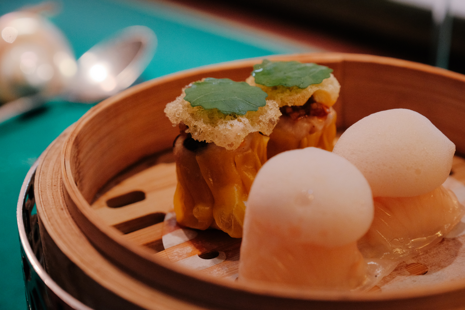 豬蝦燒賣上壓著豬皮脆片,柔軟的點心因而有了脆度與豬脂的香氣。