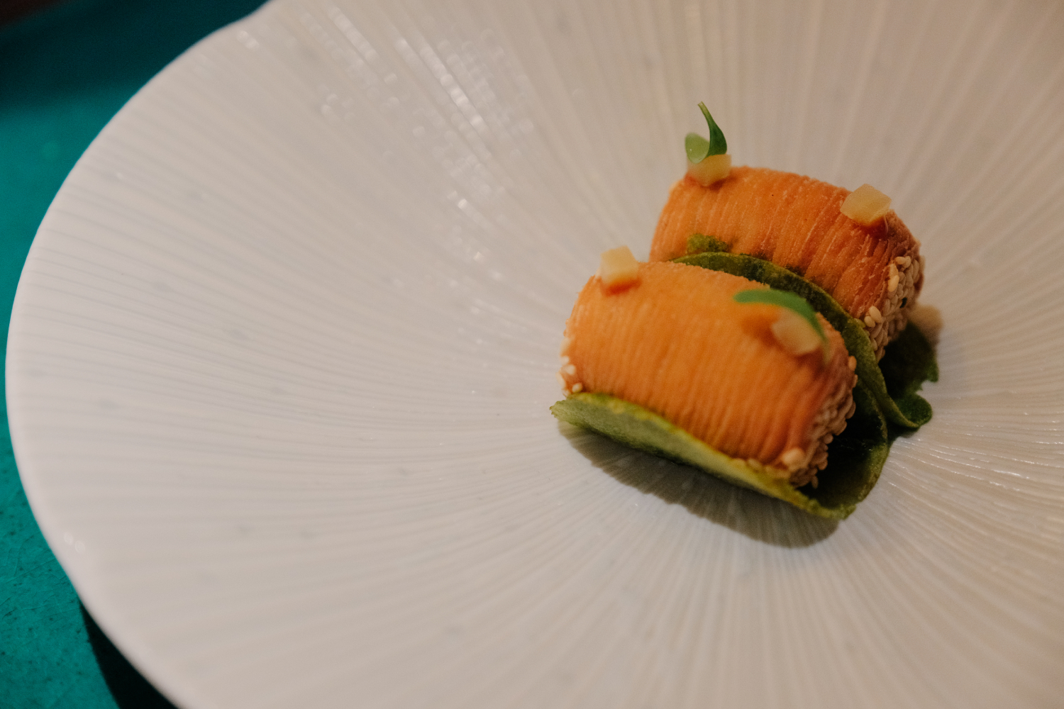 如今在 A. Wong 用餐,就像走進一座味覺與口感的主題樂園。午餐套餐裡,15 道菜中包含各種「致敬又翻玩」的中國菜:拍黃瓜配鱒魚卵;做成胡蘿蔔外型的橘色酥皮泡芙,裡面塞著紅燒兔肉;豬蝦燒賣上壓著一片豬皮脆片。甜點則是一顆蒸包,裡頭爆出鹹蛋黃流心餡。